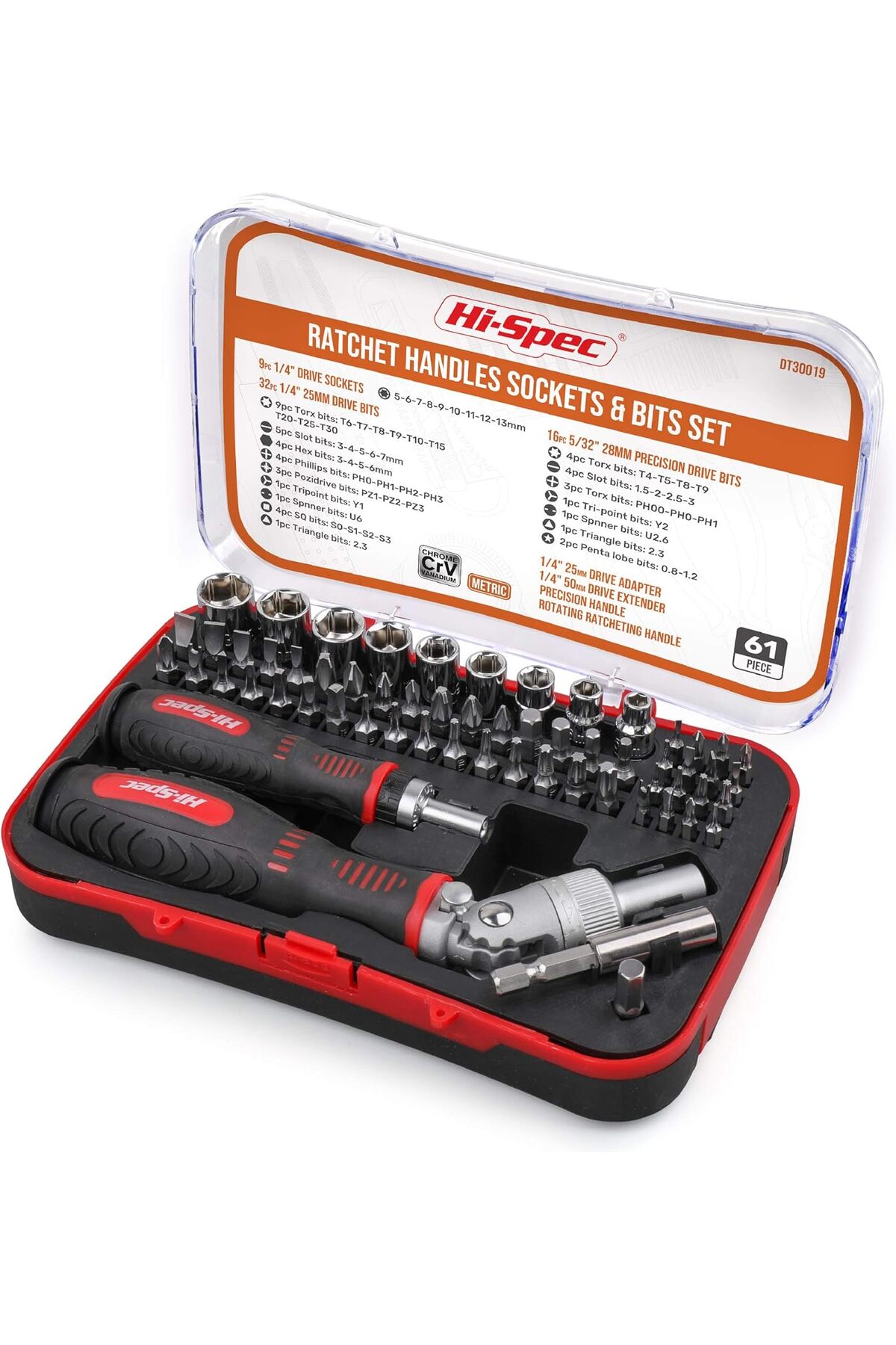 ميزات مجموعة مفكات براغي دقيقة من 61 قطعة بمقبض سقاطة بزاوية قائمة وعلبة مفكات توركس دقيقة من Hi-Spec