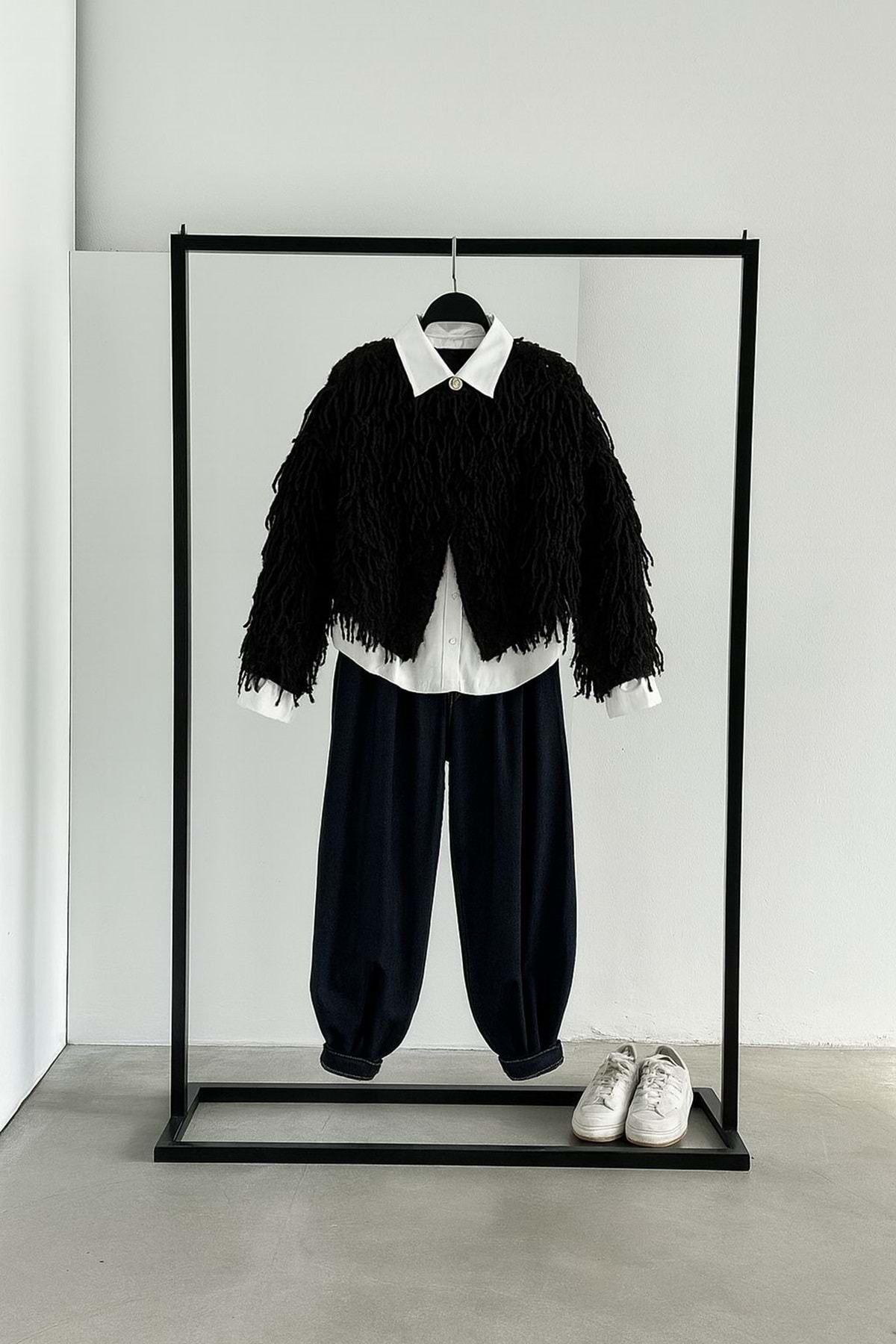 ميزات سترة قصيرة مهدبة باللون الأسود قصة فضفاضة من ibeeka