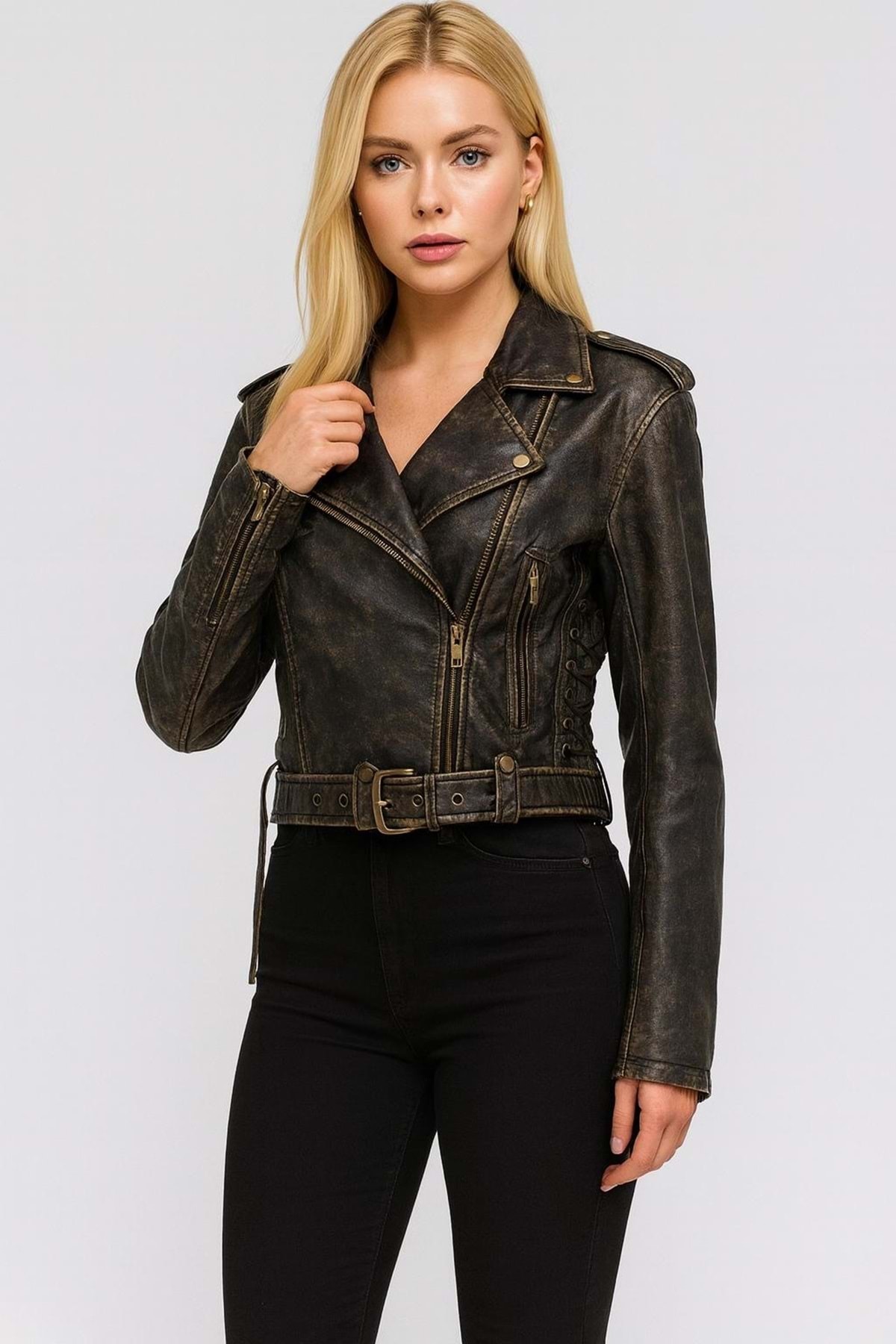 ميزات سترة جلدية بتصميم تفصيلي عتيق من البرونز من ibeeka