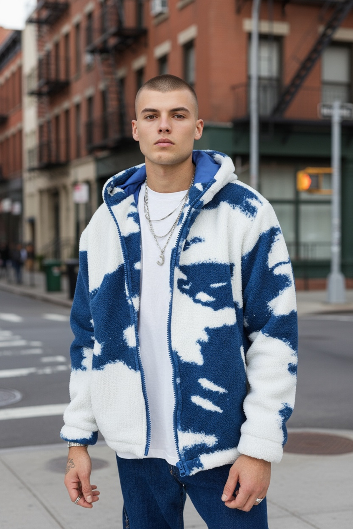 ميزات معطف من القطيفة بغطاء رأس مبطن باللون الأزرق منقوش على شكل سحابة من İLKCET MODA