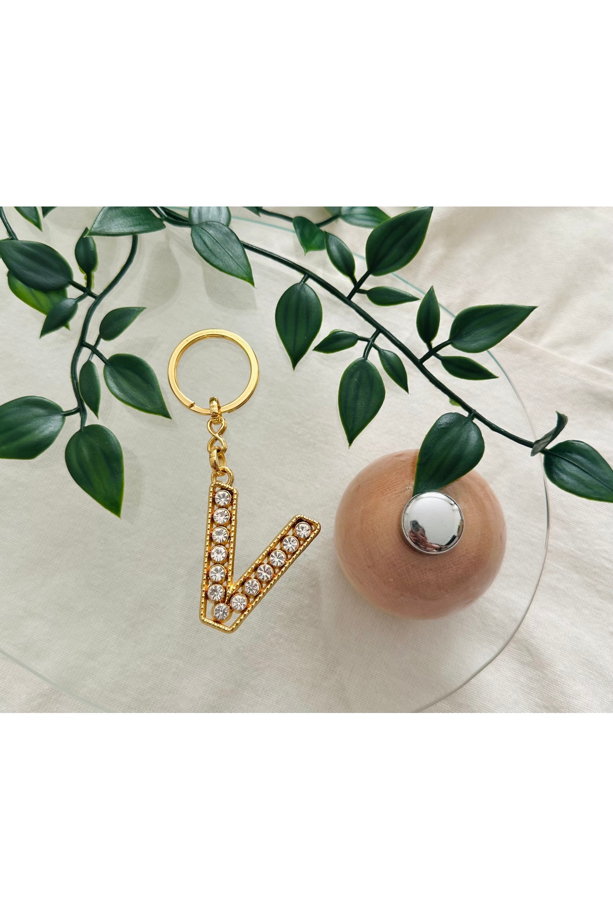 İthal سلسلة مفاتيح حجرية بحرف V ذهبي