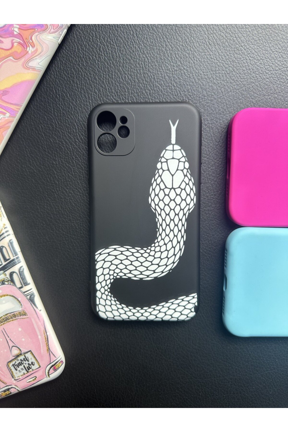 ميزات حافظة إطلاق لهاتف آيفون 11 مع نمط حماية للكاميرا باللون الأبيض على شكل ثعبان من جلد الغزال من izzytech
