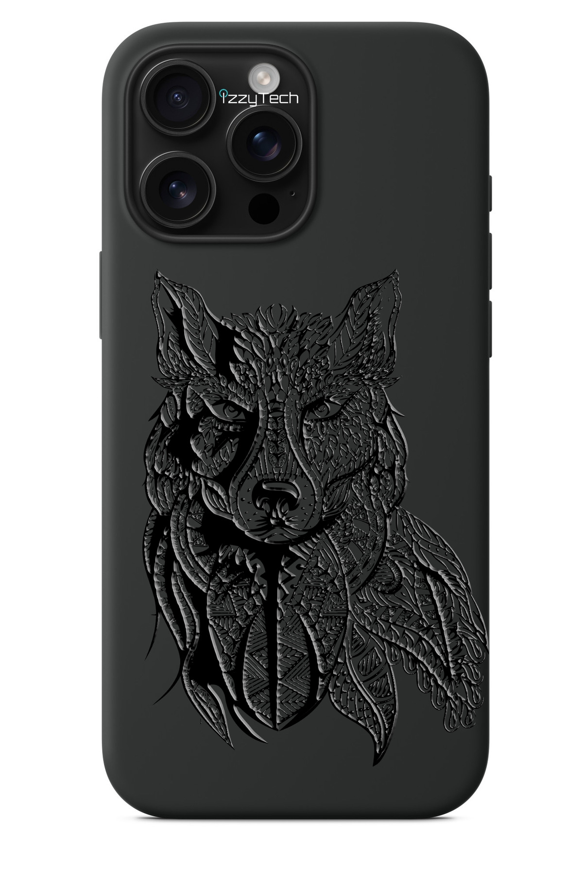 ميزات حافظة هاتف سوداء متوافقة مع iPhone 15 Plus - نمط بتأثير طلاء لامع على شكل ذئب من izzytech