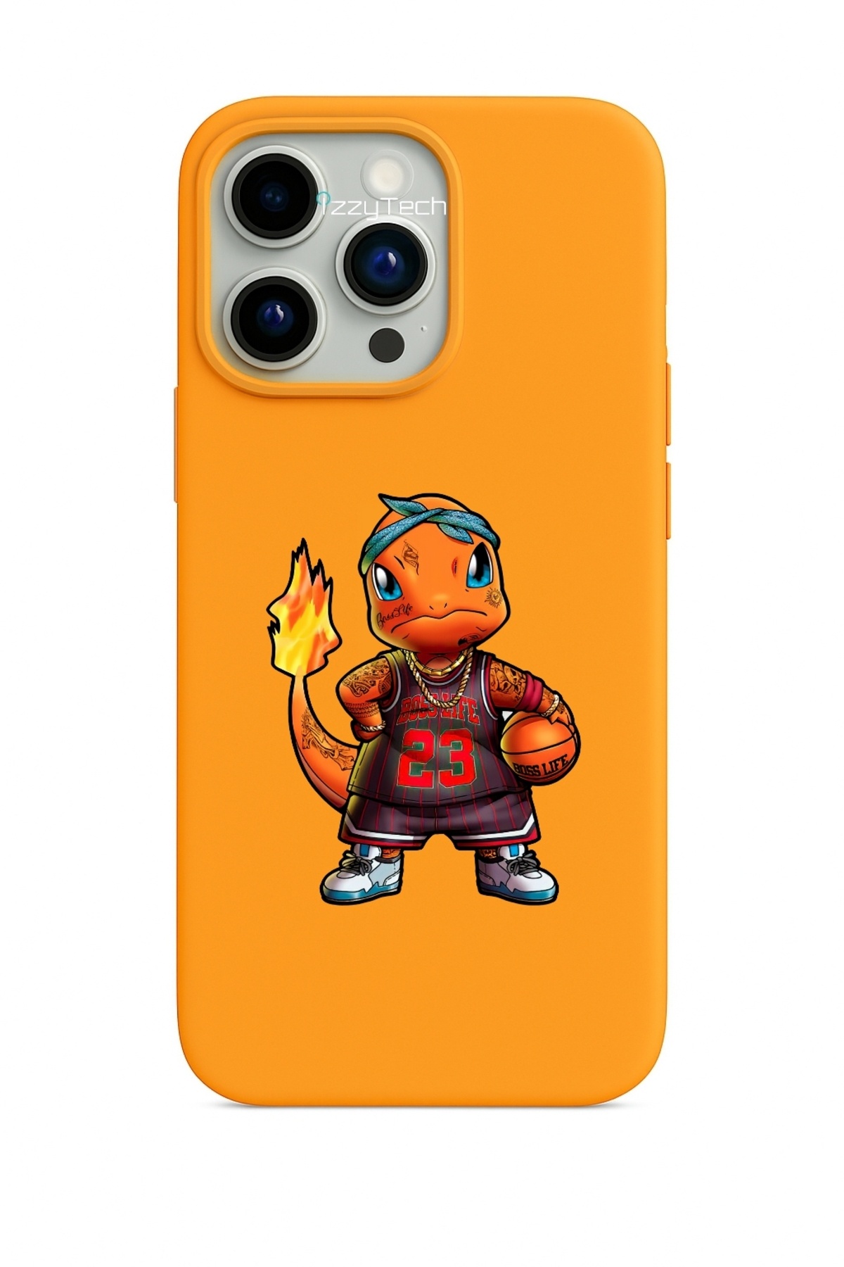 ميزات حافظة من السيليكون باللون البرتقالي بنمط جوردون 23 تشارماندر متوافقة مع هاتف آيفون 15 بلس من izzytech