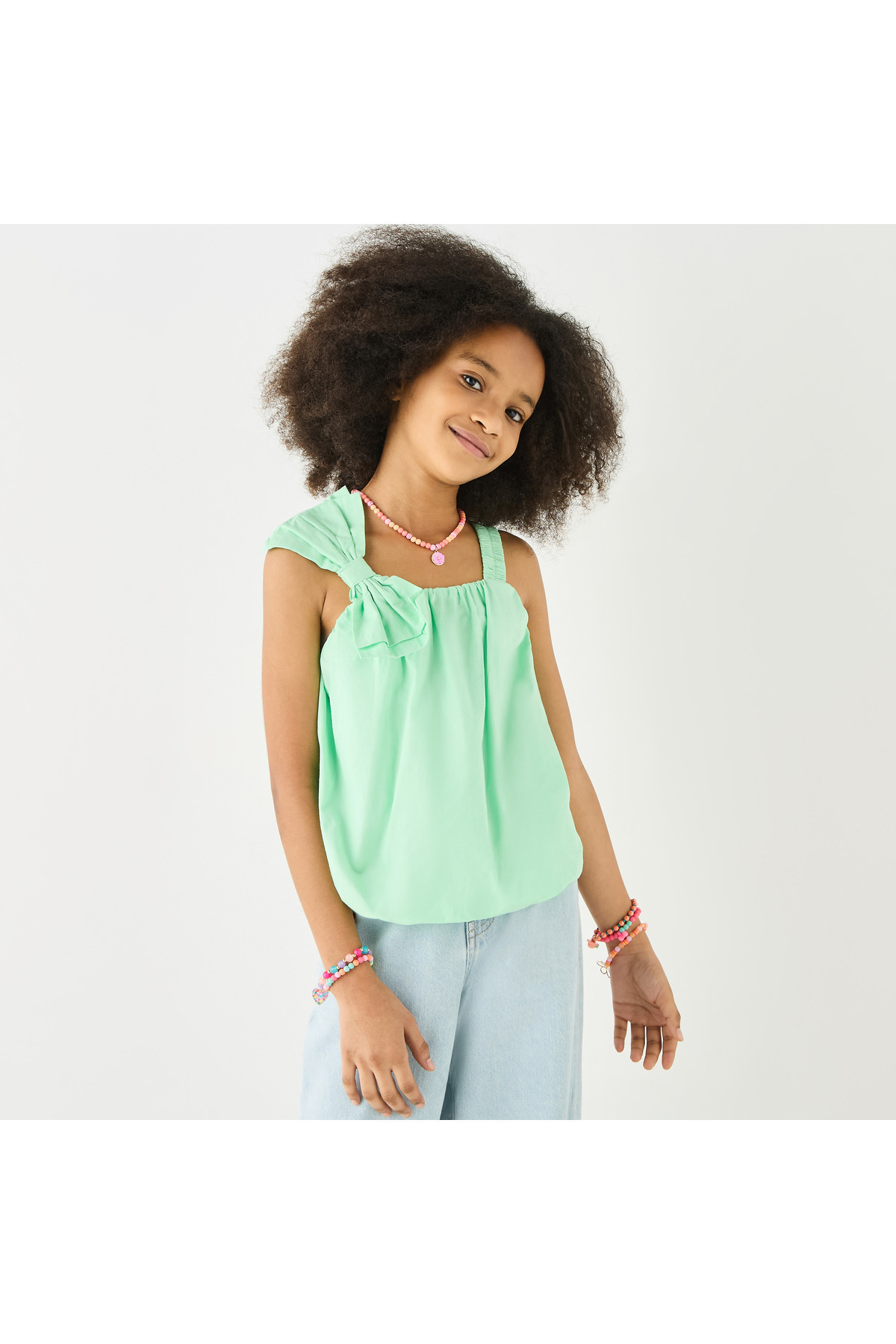 Juniors بلوزة سادة بدون أكمام مع تطريز فيونكة ورقبة مربعة