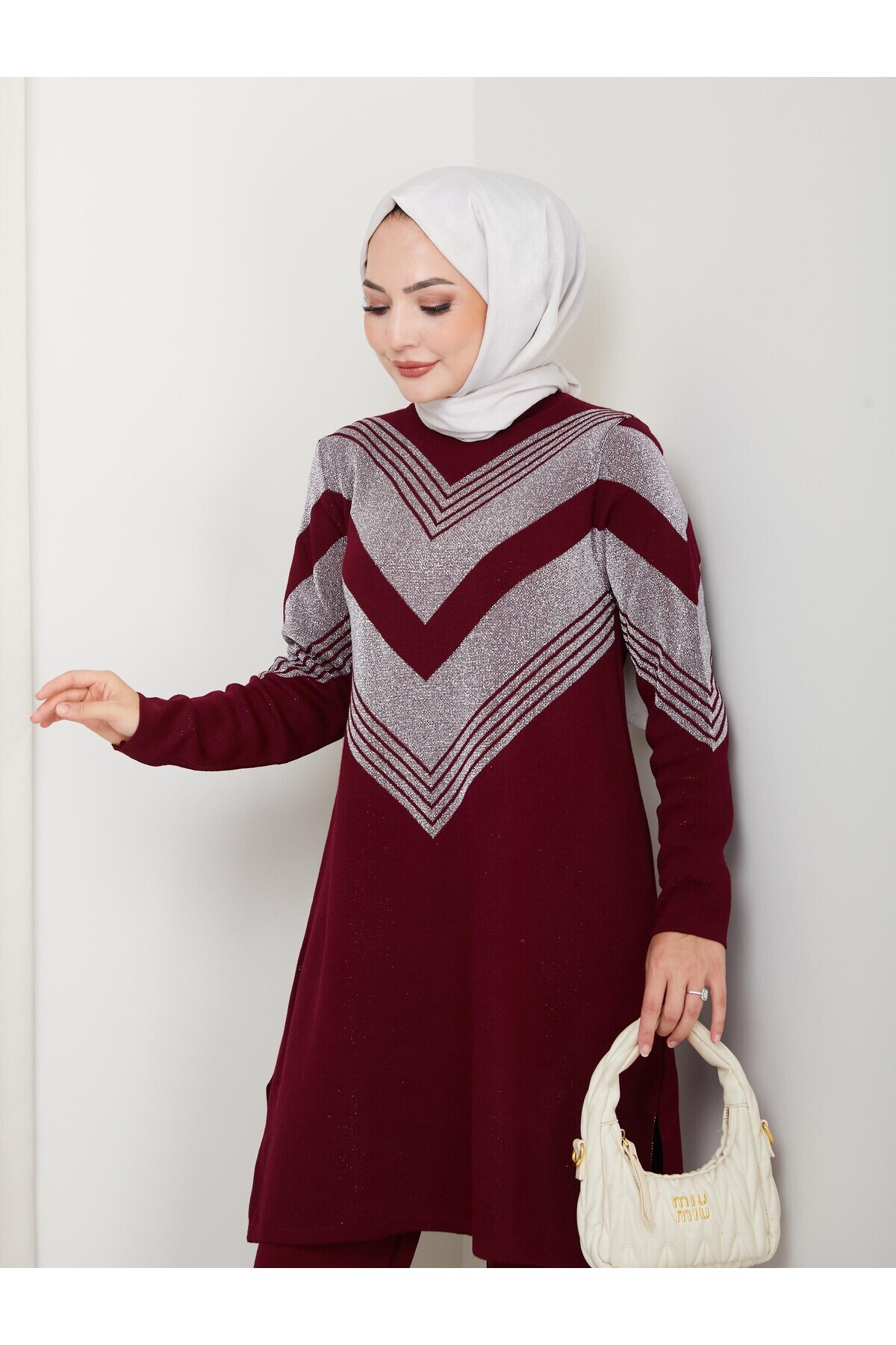 ميزات تونيك فضي منقوش على شكل حرف V من KAYA BUTİK