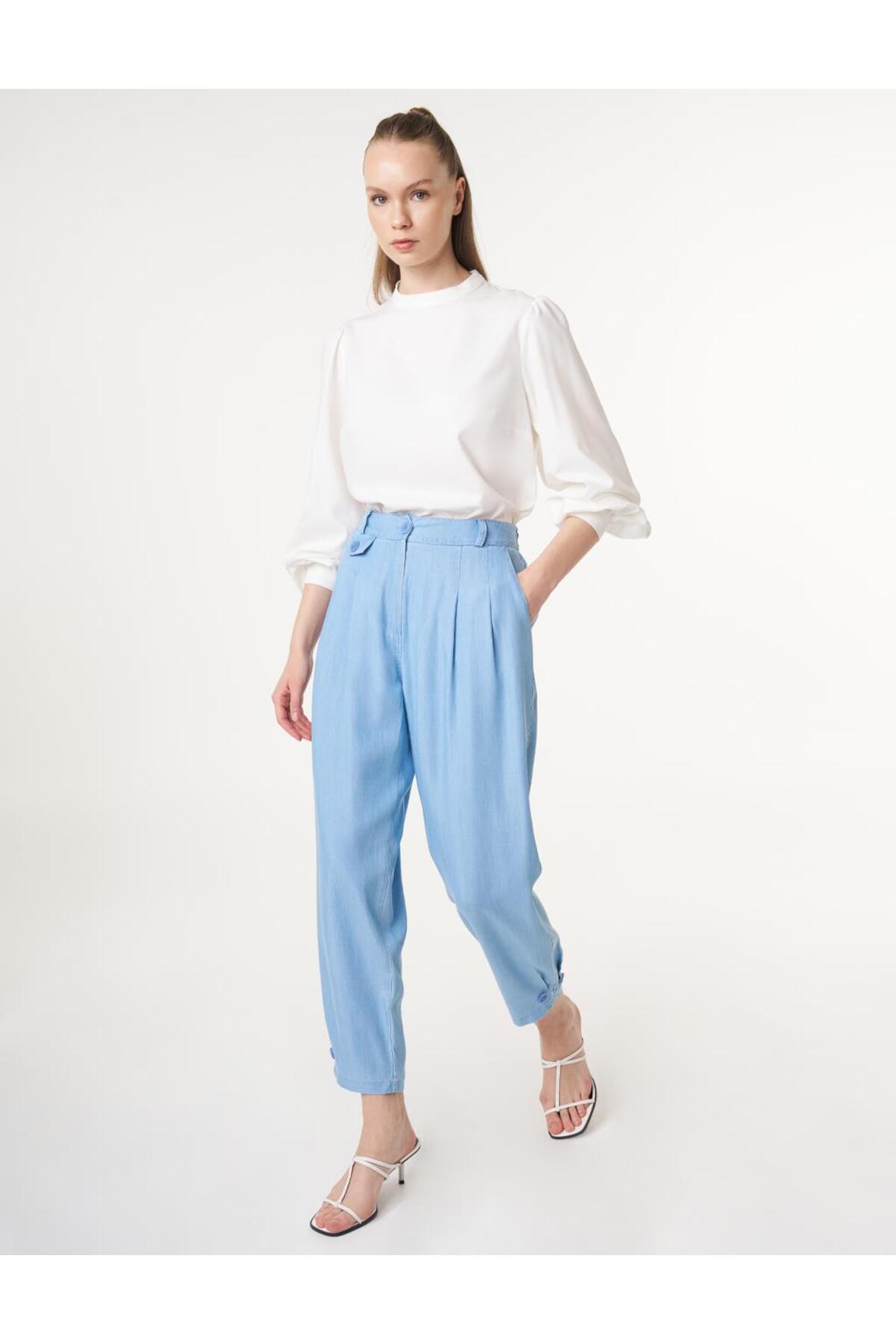ميزات بنطلون من قماش الدنيم الأزرق بأزرار على الساق من Kayra