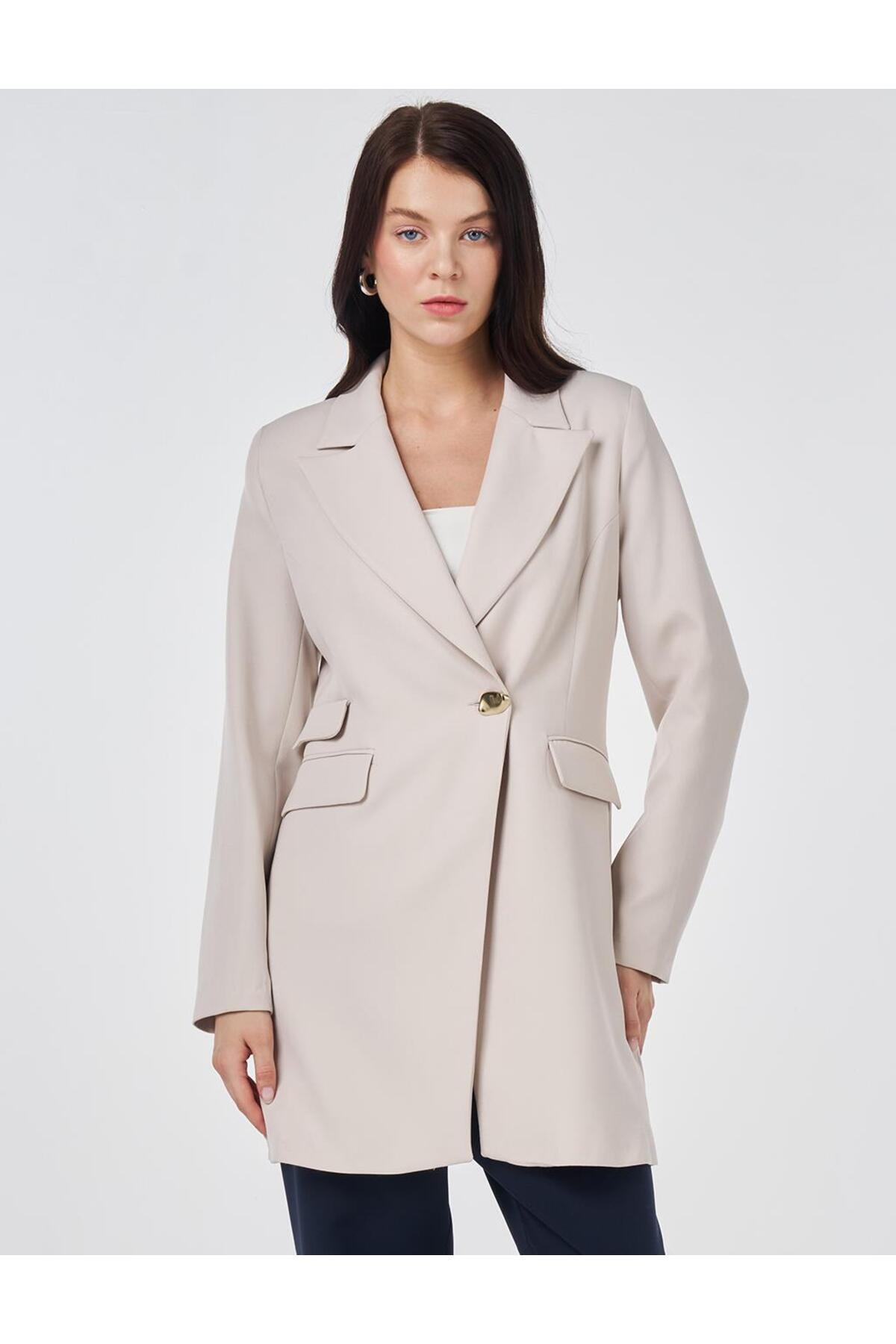 ميزات سترة بليزر بزر واحد باللون الرمادي الفاتح من Kayra