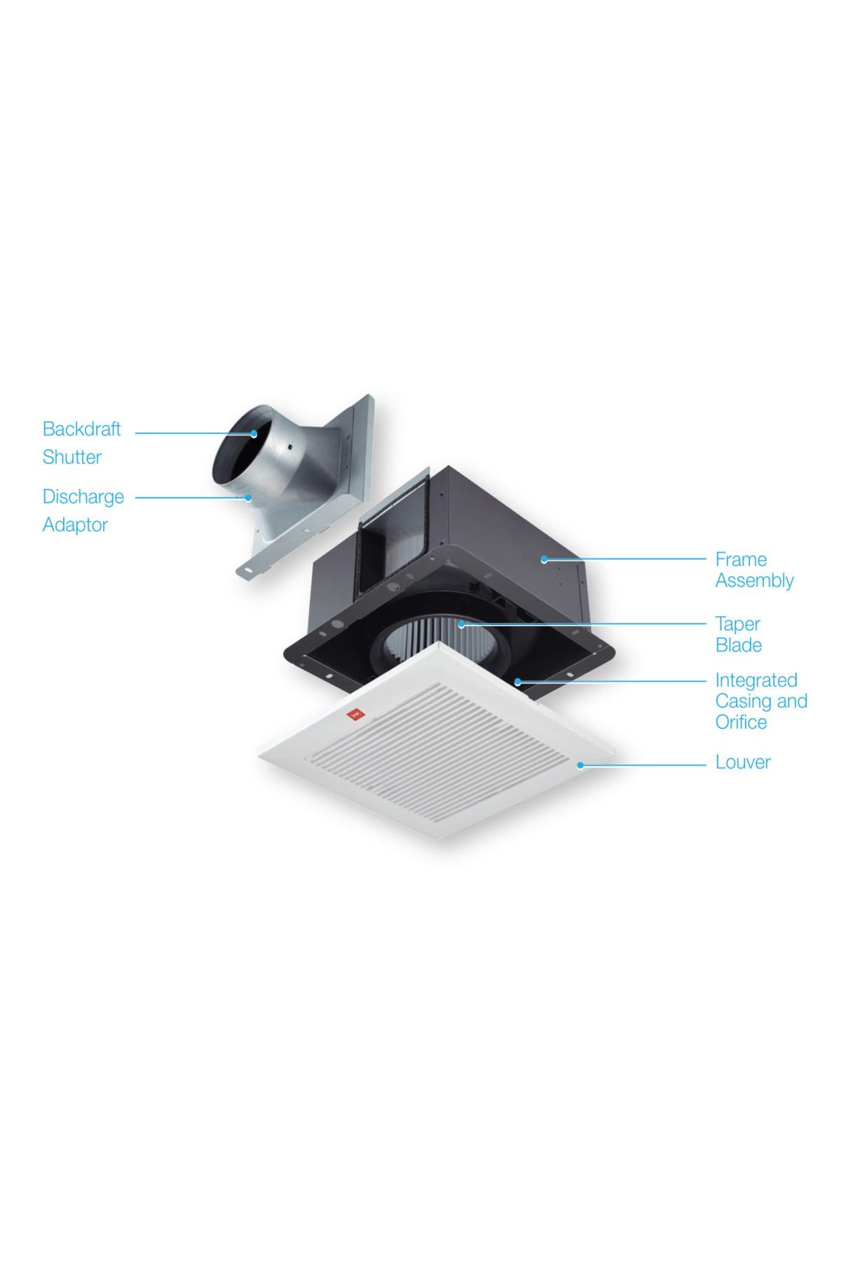 Super low noise, long life ball bearing motor, taper blade sirocco fan, resonance-noise-absorption structure, reverse flow prevention shutter, pre-installed power cord, exhaust type