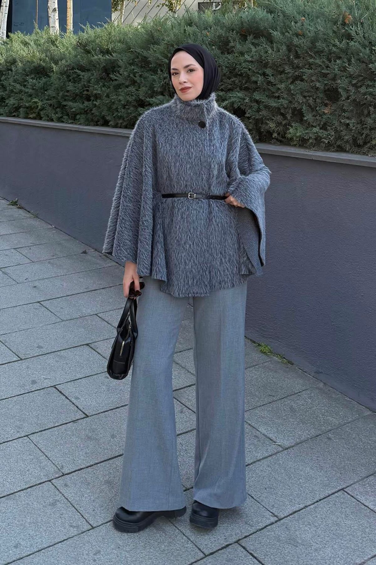 ميزات معطف بحزام وأزرار باللون الرمادي من lamelif