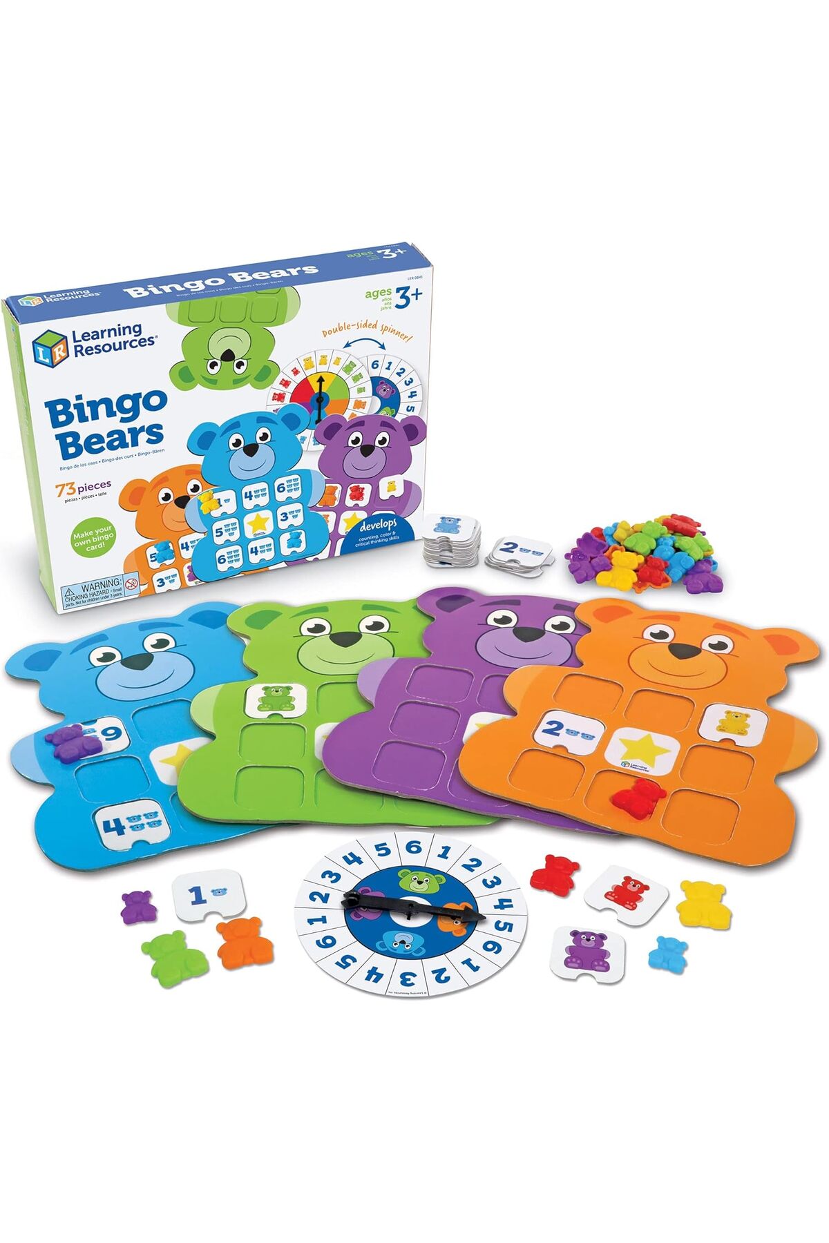 Develop preschool learning skills with this innovative bingo-inspired game; customizable playing cards ensure no two rounds are alike! Two ways to play: Once kids finish setting up their bingo cards, they can enjoy two different ways to play this engaging game for little ones; either by matching pieces by their numbers or sorting them by size and color! Fun for social and emotional learning: As kids make their way to bingo victory through spinning and matching, they also gain essential social-emotional learning skills; like taking turns and following directions!