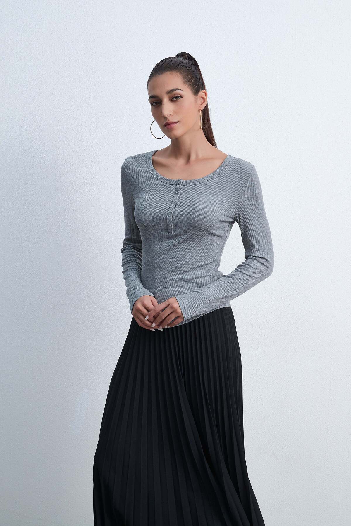 ميزات بلوزة سادة بأكمام طويلة وأزرار من Livia