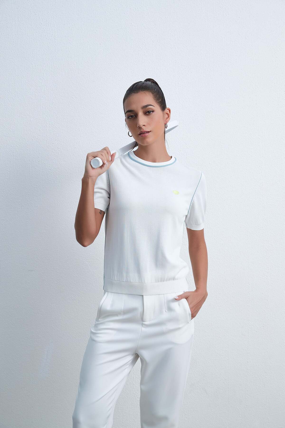 ميزات بلوزة سادة بياقة دائرية وأكمام نصفية من Livia
