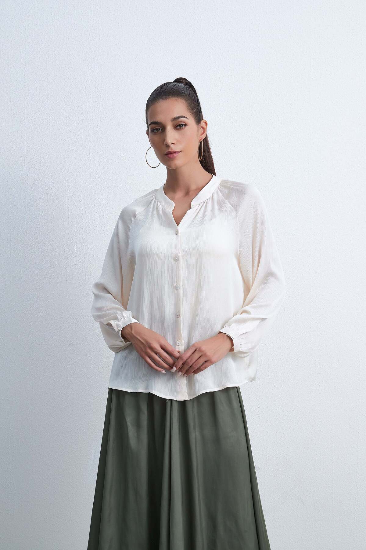 ميزات بلوزة سادة بأكمام طويلة وأزرار من Livia