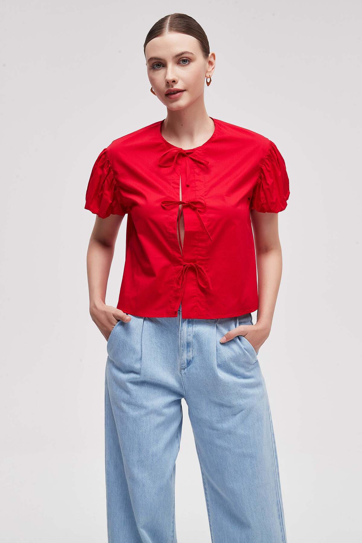 ميزات بلوزة سادة بأكمام منتفخة مكشكشة من Livia