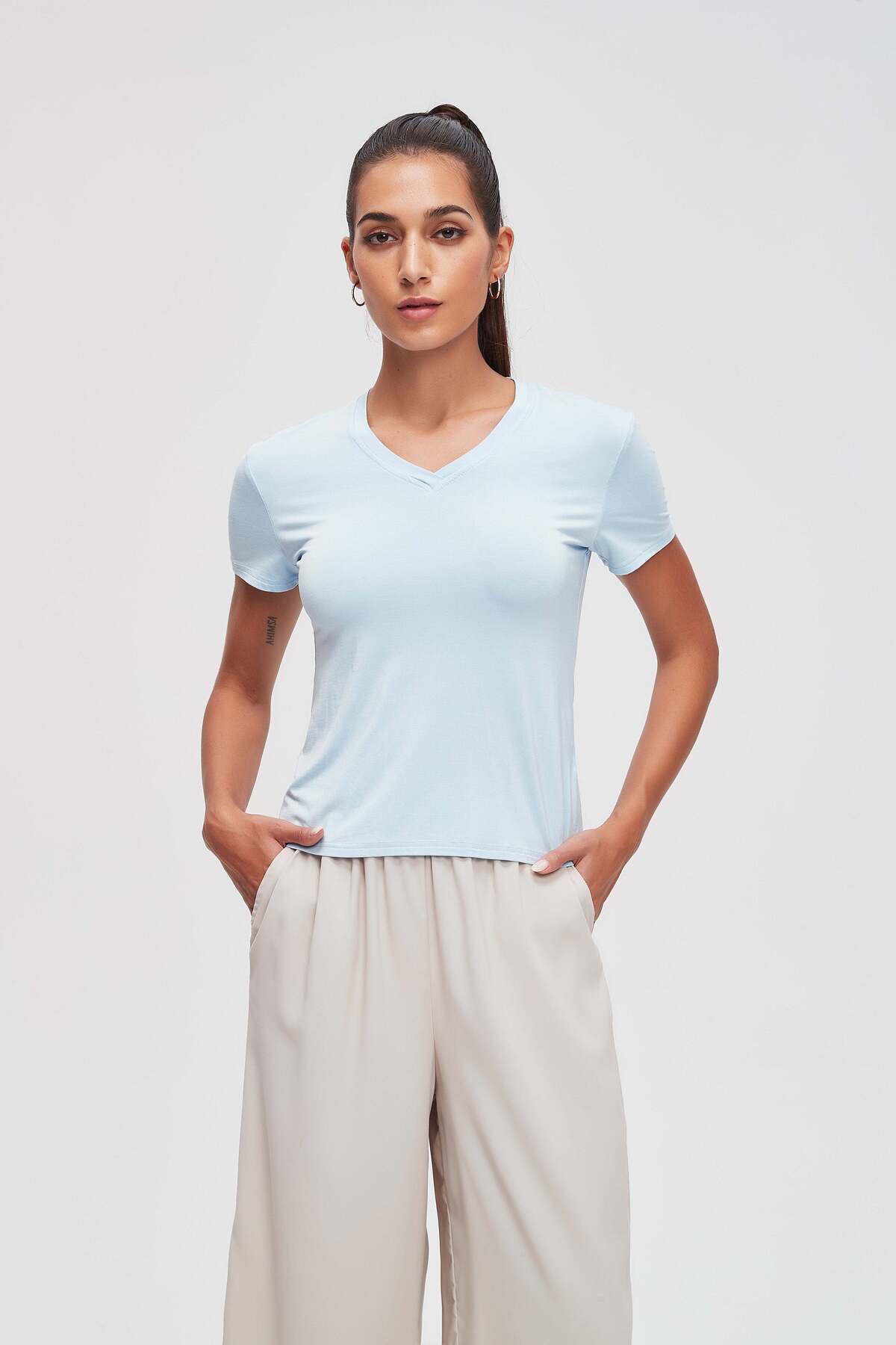 ميزات بلوزة سادة برقبة على شكل حرف V وأكمام نصفية من Livia