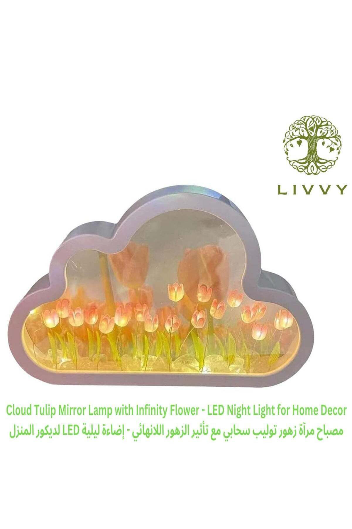 Dual Functionality: Cloud mirror and tulip lamp, Effortless Elegance: Fully assembled design, Enchanting Illumination: Garden of glowing flowers, Everlasting Beauty: No maintenance tulip garden, Mesmerizing Reflection: Infinite mirror effect