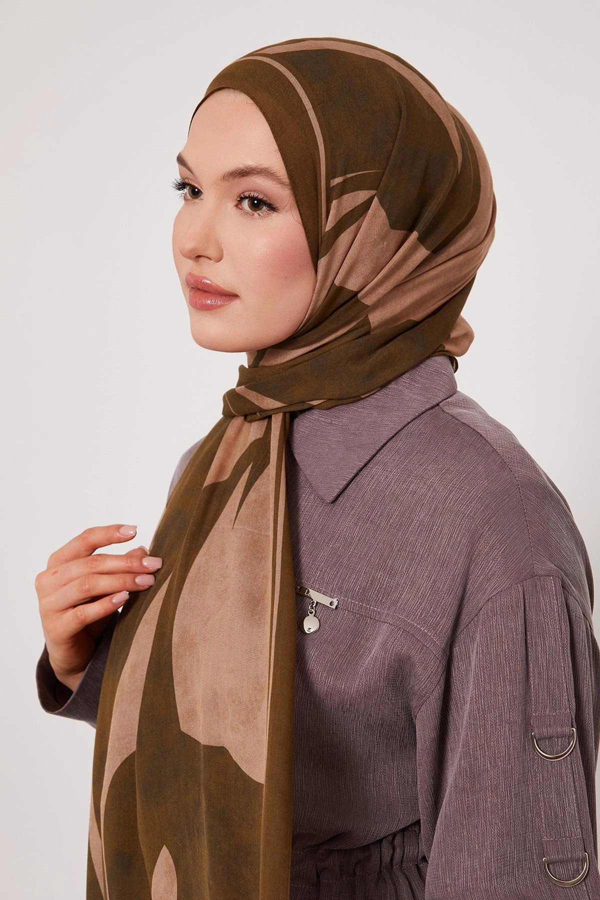 LuvenSara شال حريري منقوش - أخضر زيتوني
