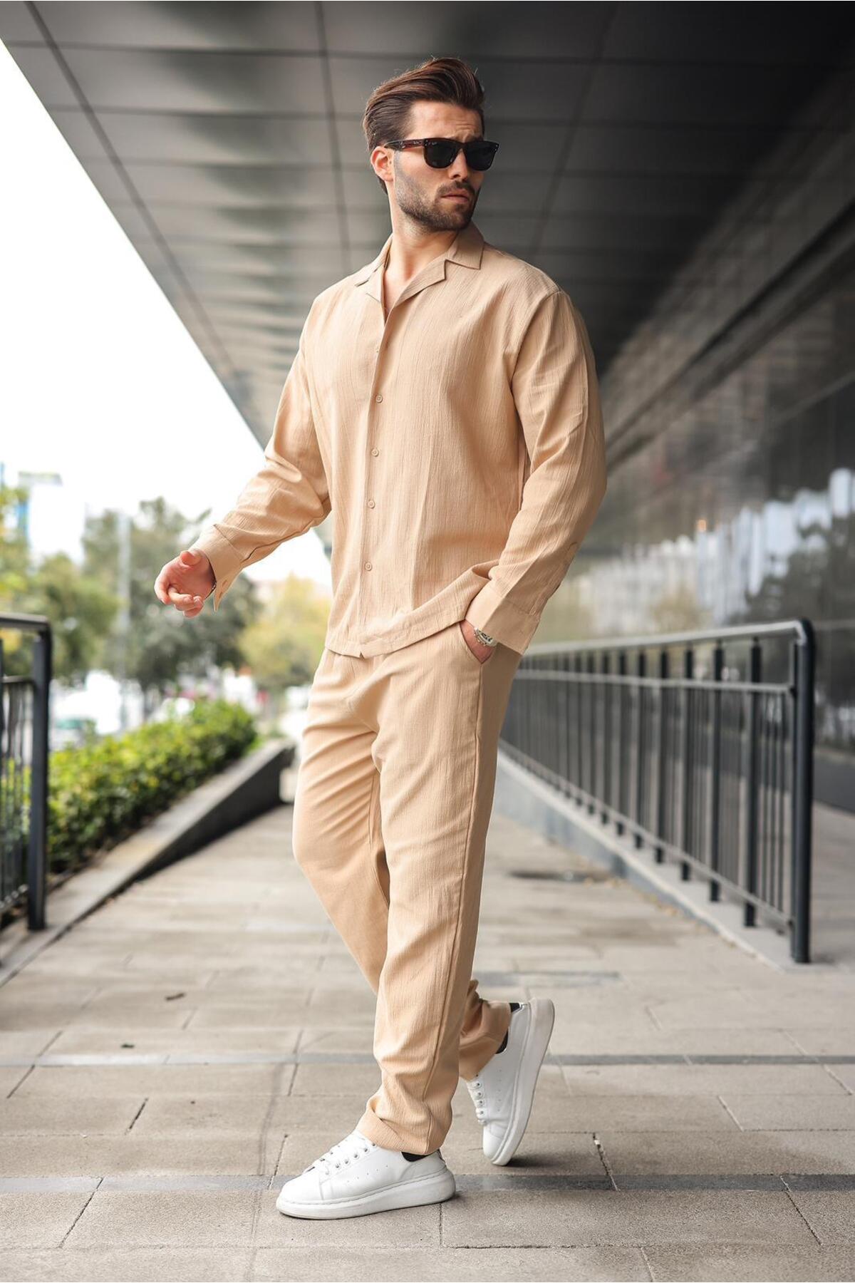 Madmext طقم قميص وبنطلون رجالي أساسي بأزرار بيج E7335
