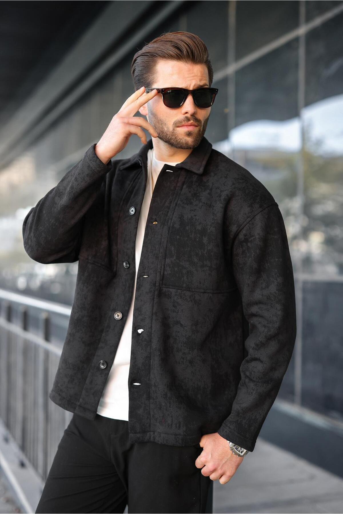 ميزات سترة قميص سوداء مع بطانة من الصوف E6767 من Madmext