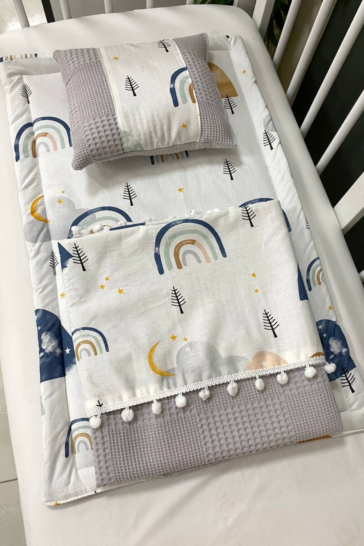 ميزات طقم بطانية منقوشة رمادية/زرقاء غائمة مكونة من 3 قطع من Masallar Diyarı