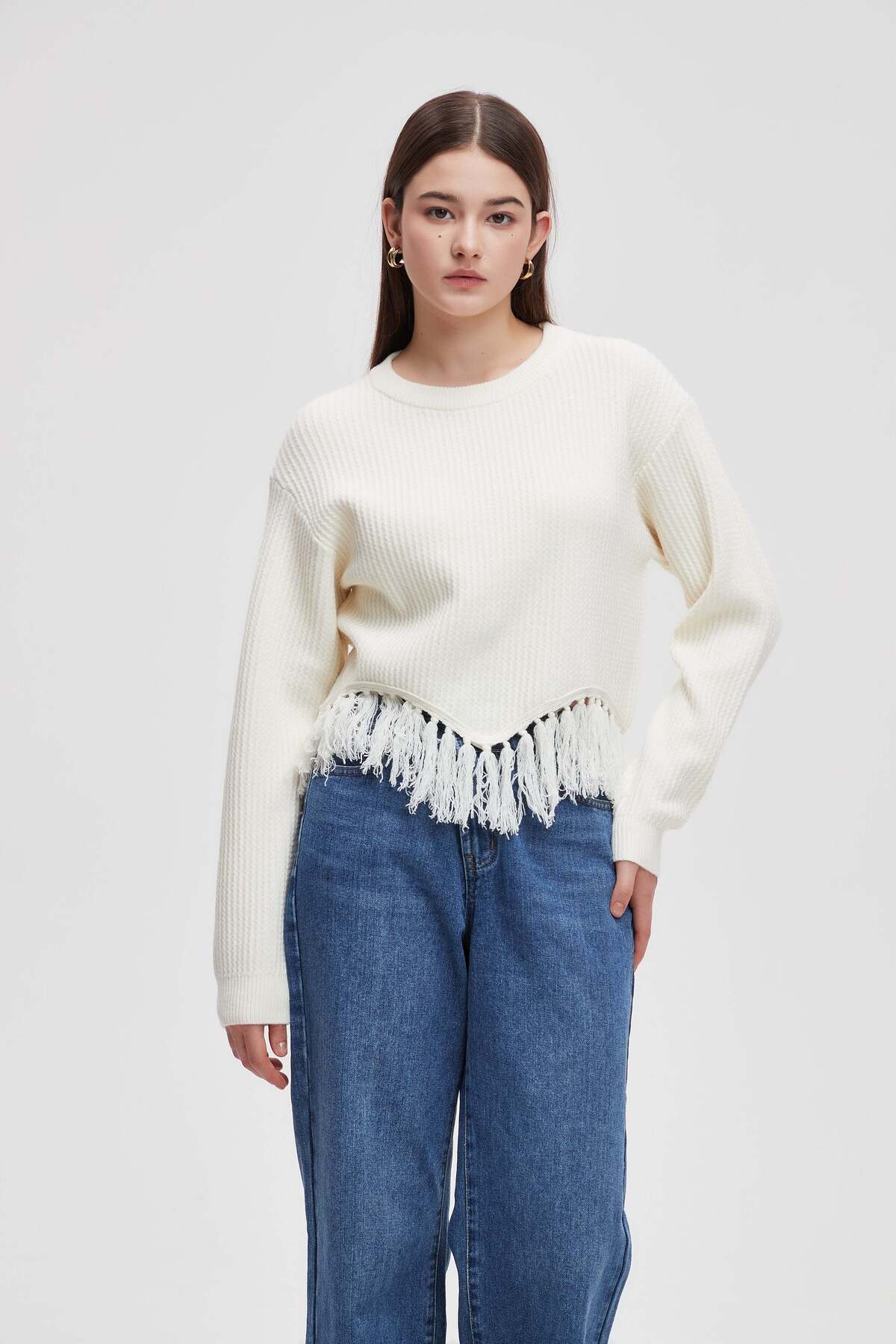ميزات بلوزة طويلة سادة مزينة بشراشيب من menta
