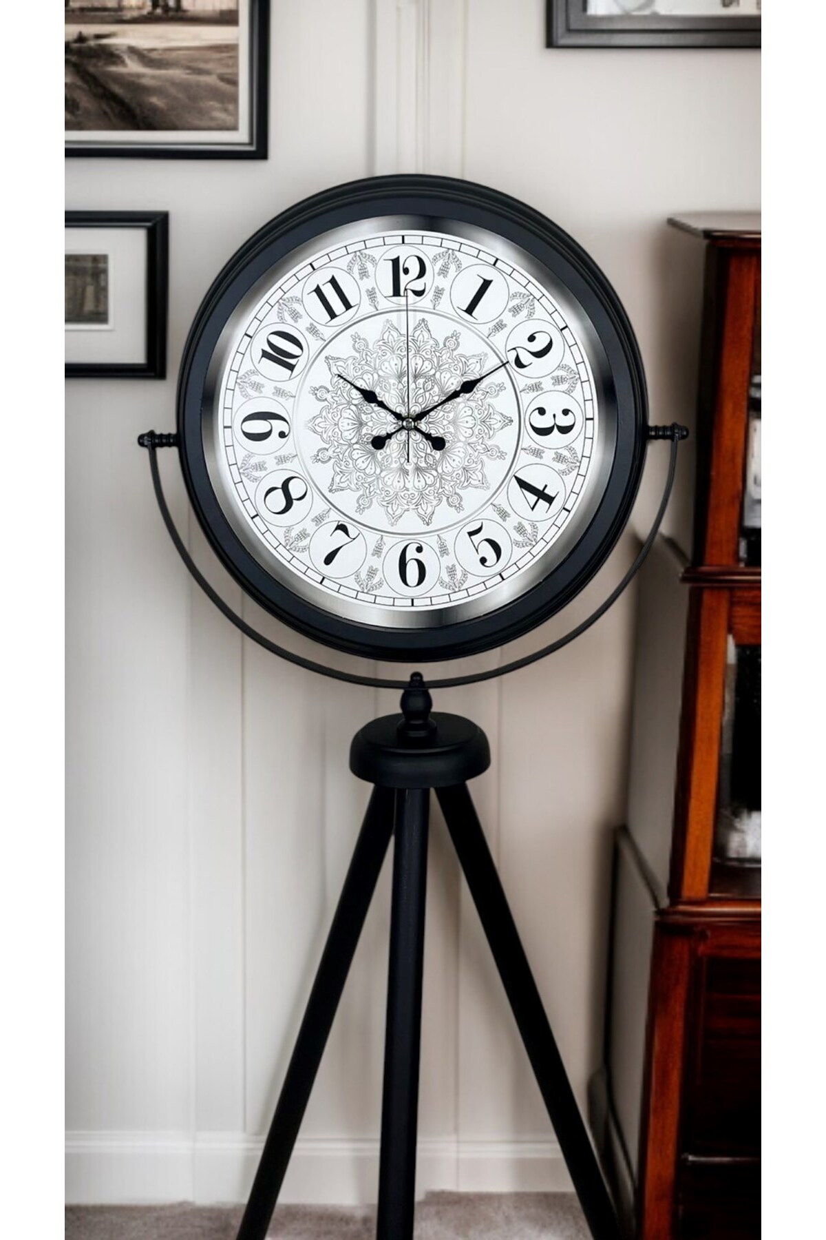 ميزات ساعة أنيقة ذات قاعدة ثلاثية الأرجل منقوشة باللون الأسود من MericLine