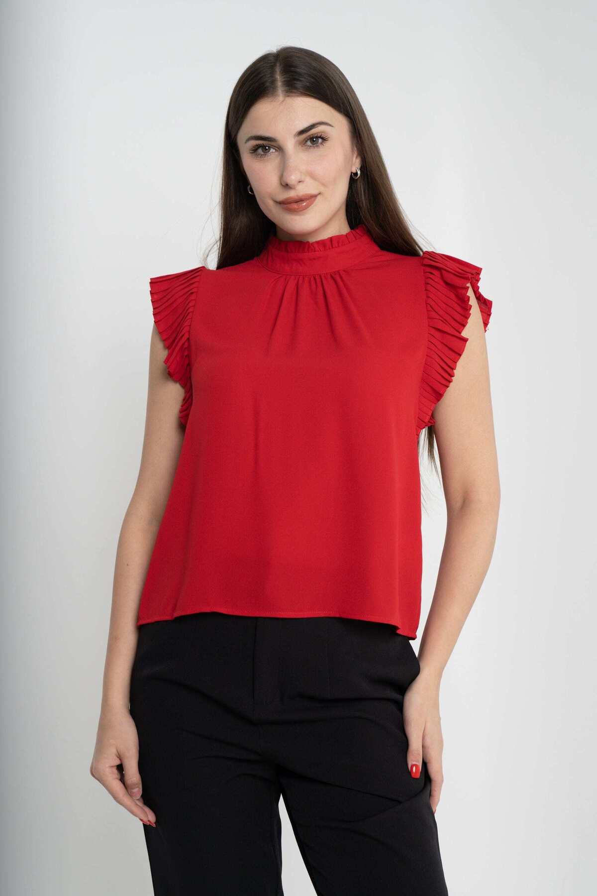 ميزات بلوزة سادة بأكمام قصيرة مكشكشة من mica