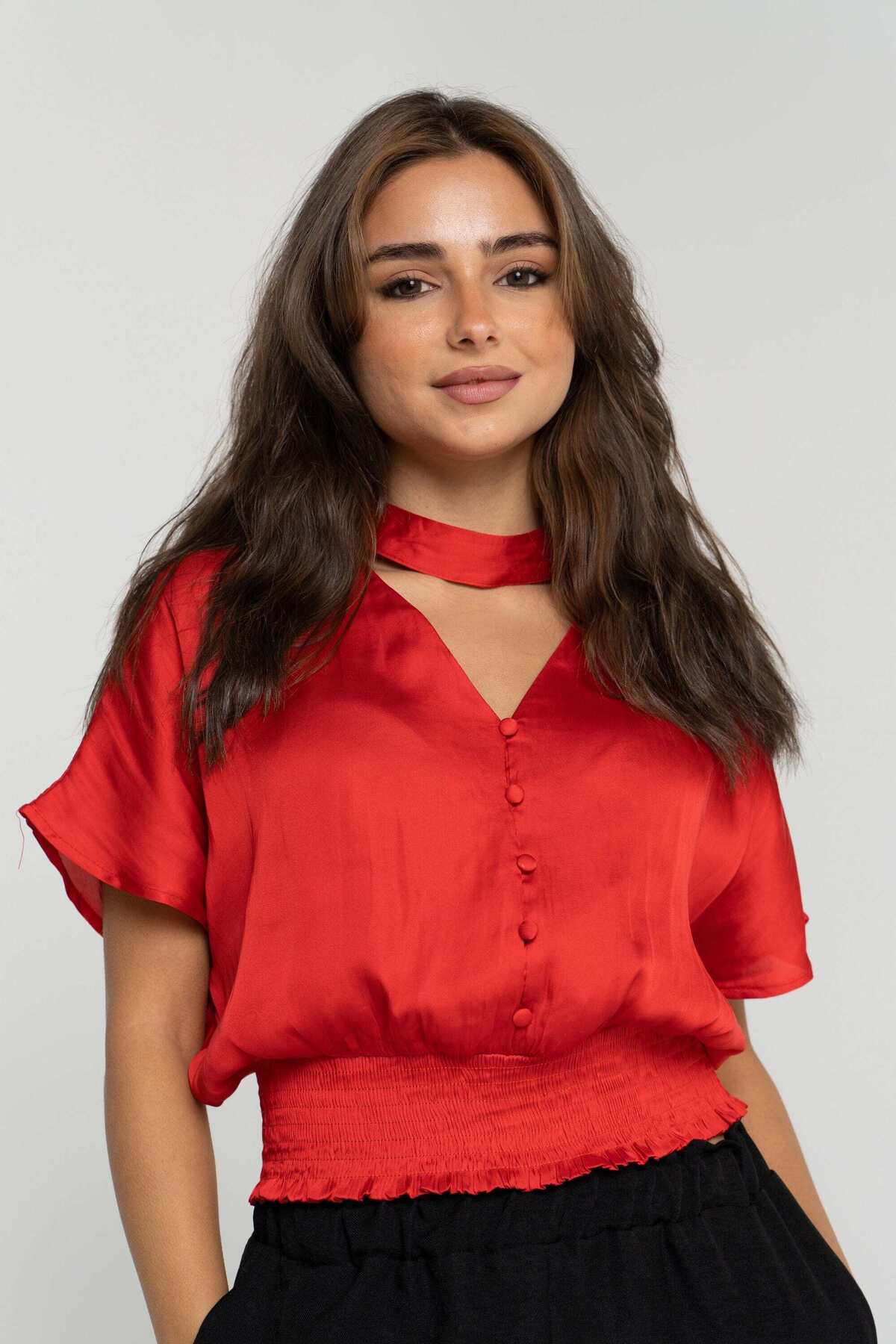ميزات بلوزة سادة بأزرار أمامية وأكمام قصيرة من mica