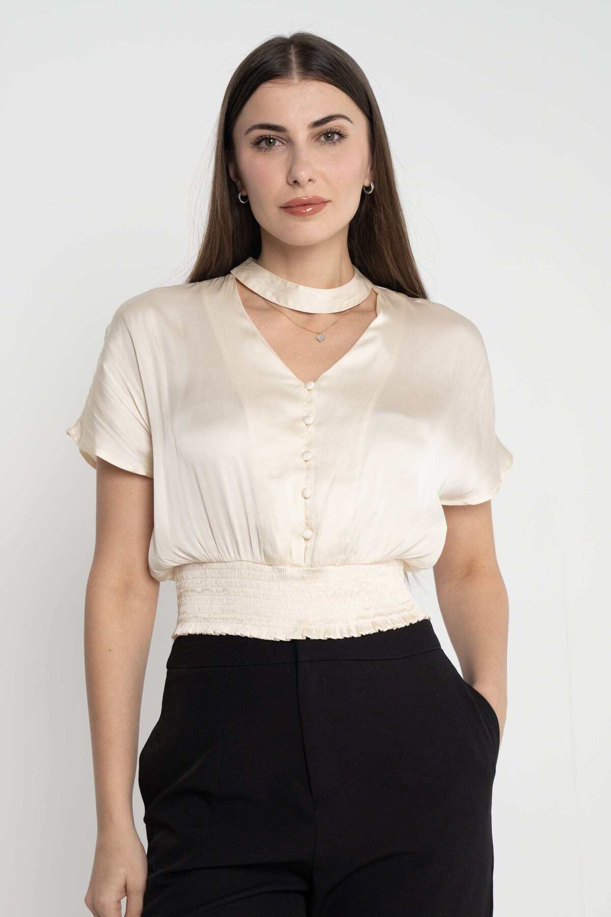 ميزات بلوزة سادة بأزرار أمامية وأكمام قصيرة من mica