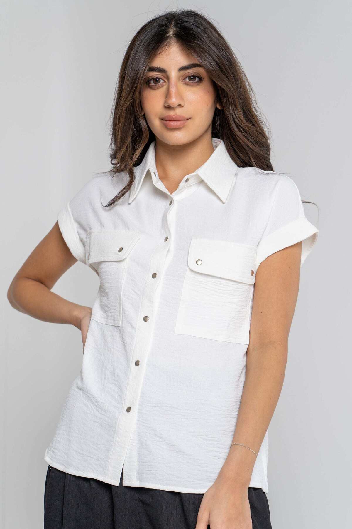 ميزات قميص سادة بأزرار أمامية وجيوب وأكمام قصيرة من mica