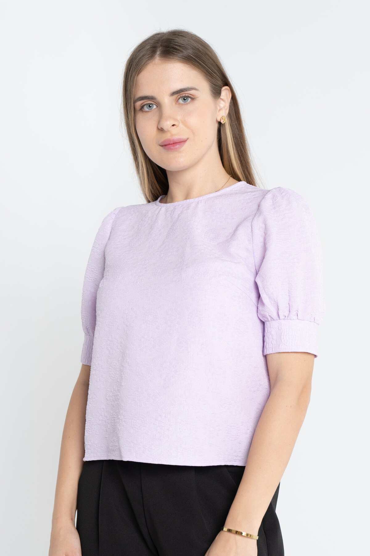 ميزات بلوزة سادة بأكمام منفوخة من mica