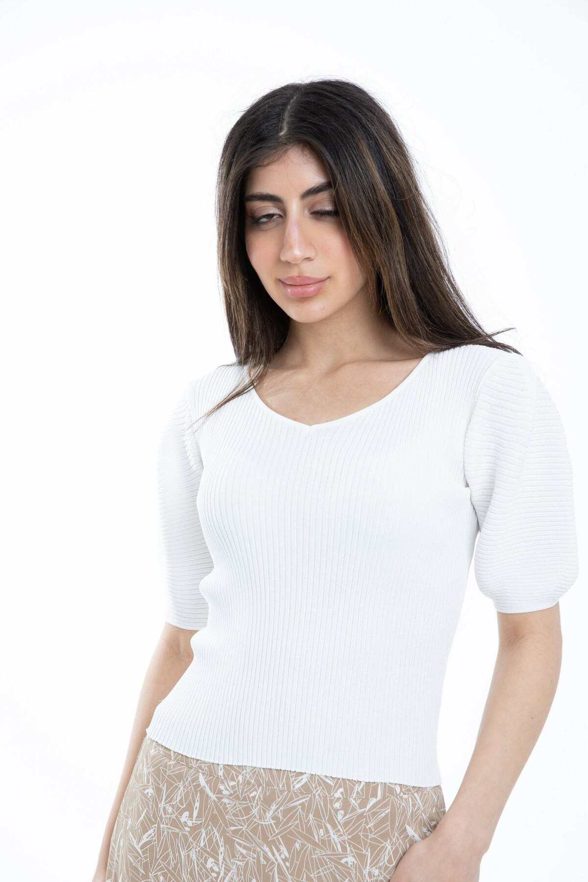 ميزات بلوزة سادة بأكمام منتفخة مضلعة من mica