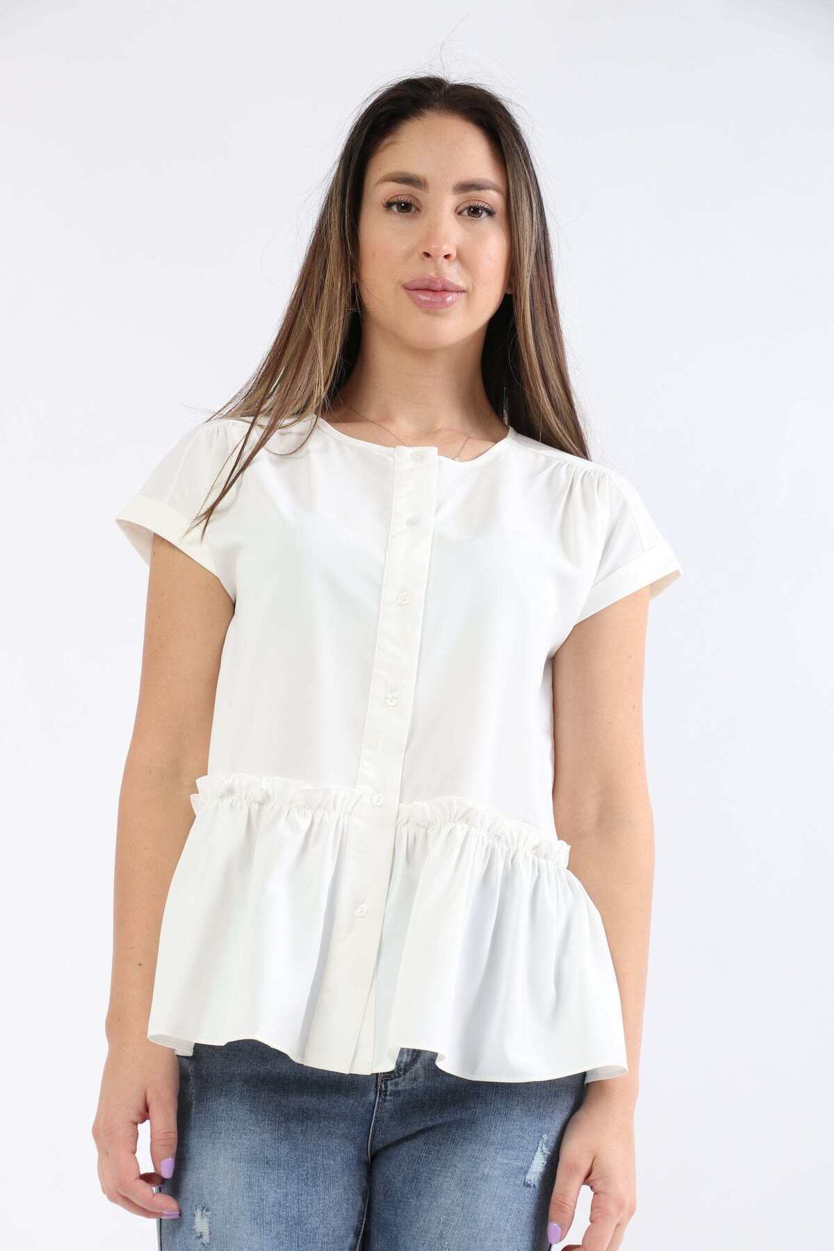 ميزات بلوزة سادة بأكمام قصيرة وحافة مكشكشة من mica