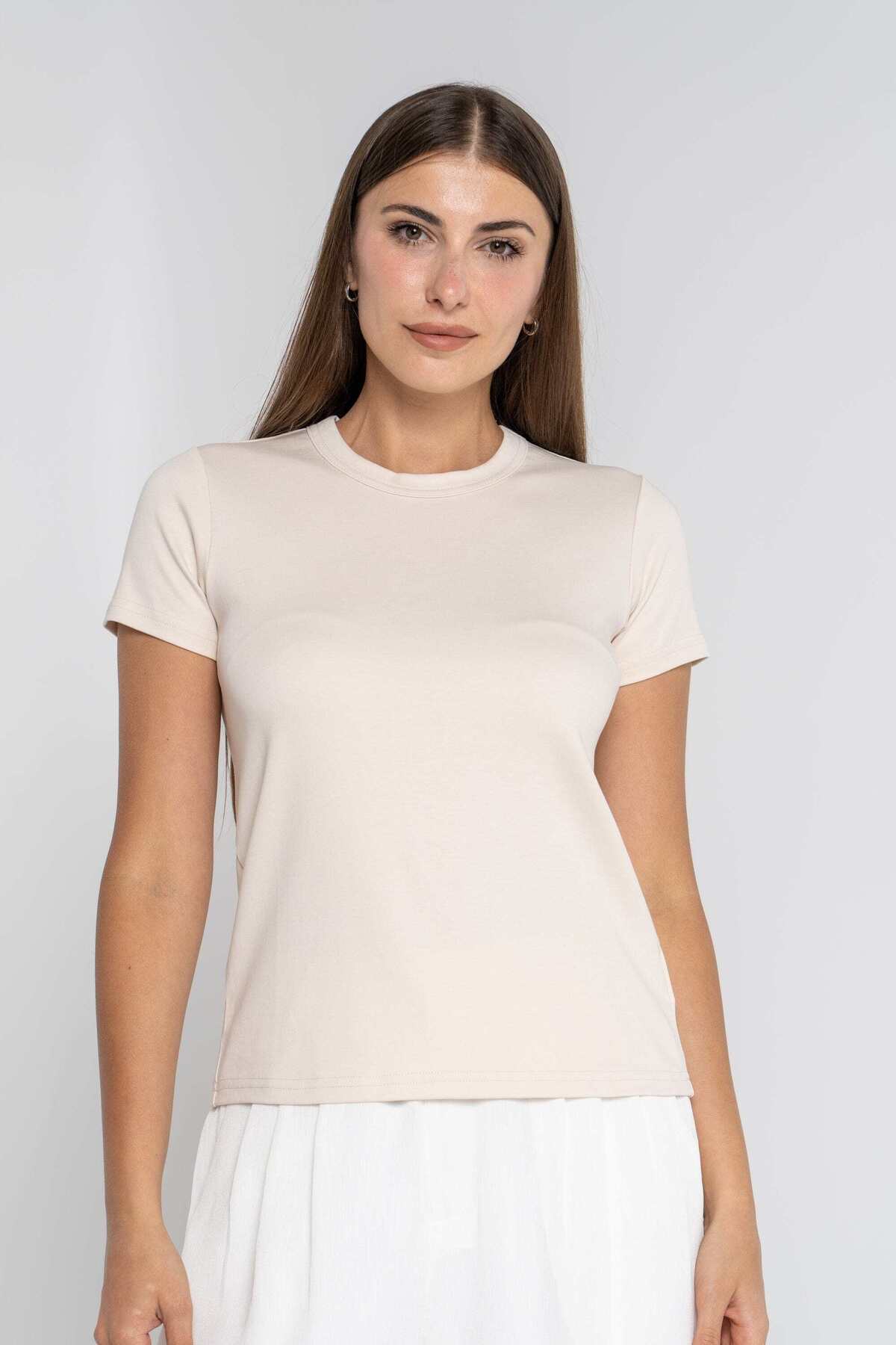 ميزات بلوزة سادة بأكمام قصيرة ورقبة دائرية من mica