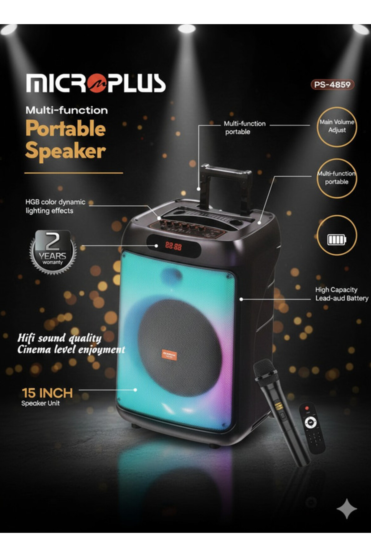 ميزات مكبر صوت بلوتوث محمول كبير 15 بوصة مع شاشة LED وجهاز تحكم عن بعد من Micro Plus