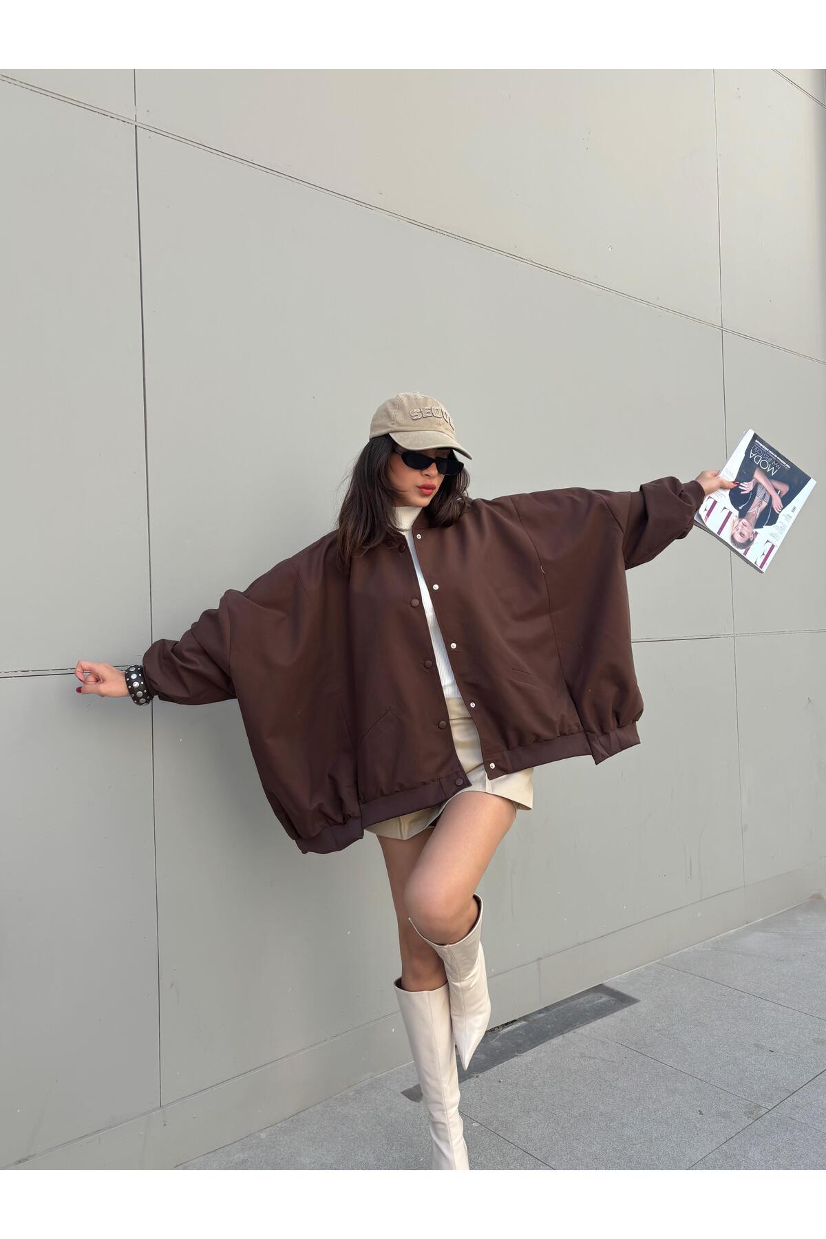 minaaise قصة فضفاضة سترة بامبر مبطنة باللون البني