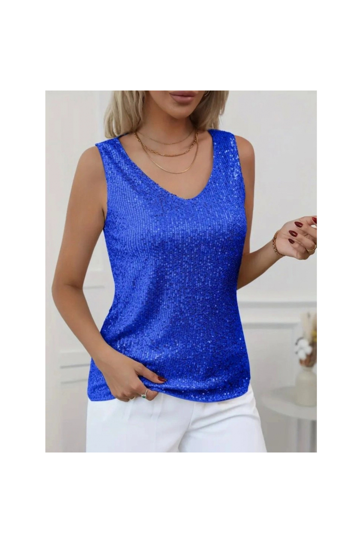 ميزات بلوزة بدون أكمام مطرزة بالترتر - أزرق بلون الكوبالت من MissRunin