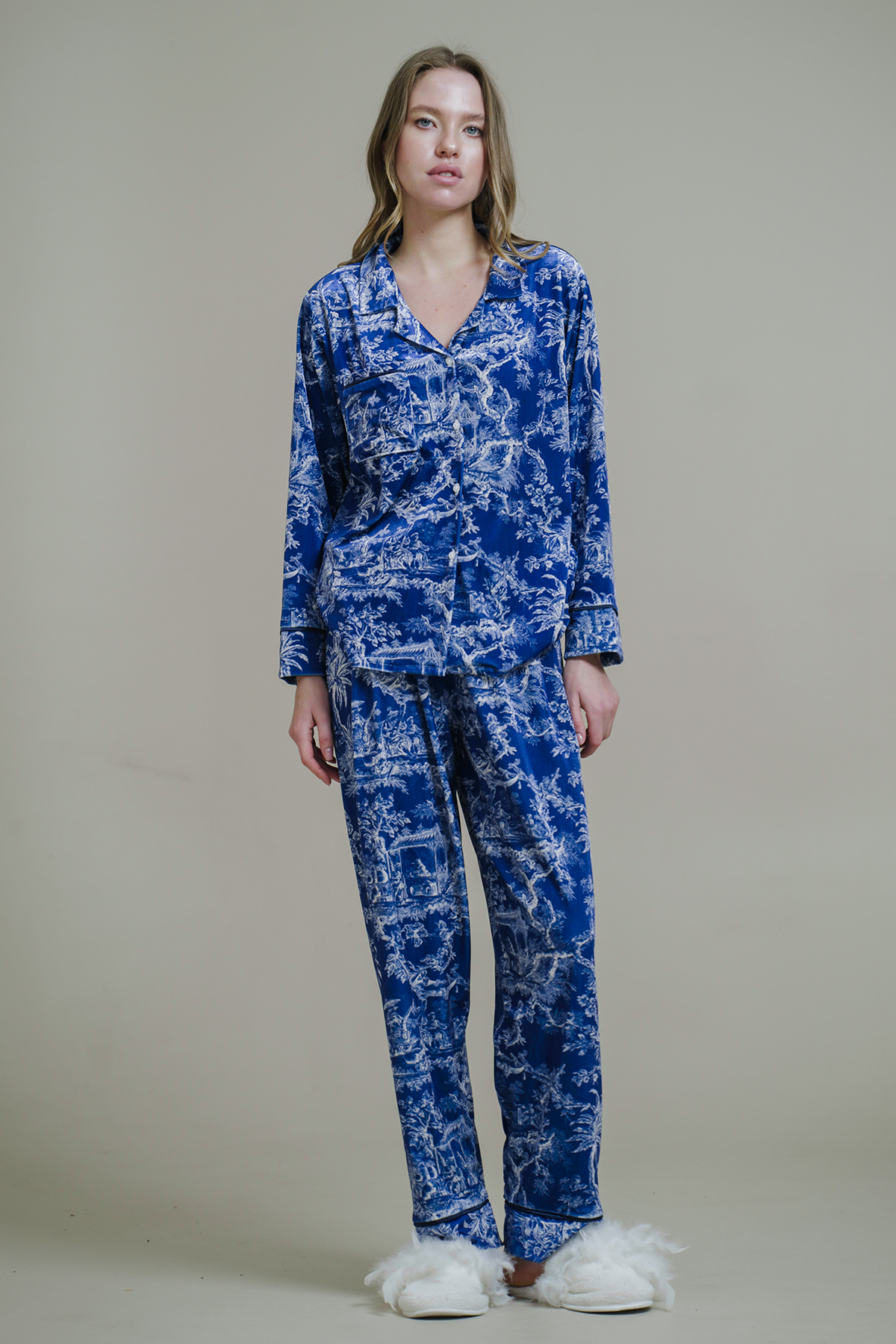 ميزات طقم بيجامة مخملية منقوشة باللون الأزرق الداكن من Mita Concept