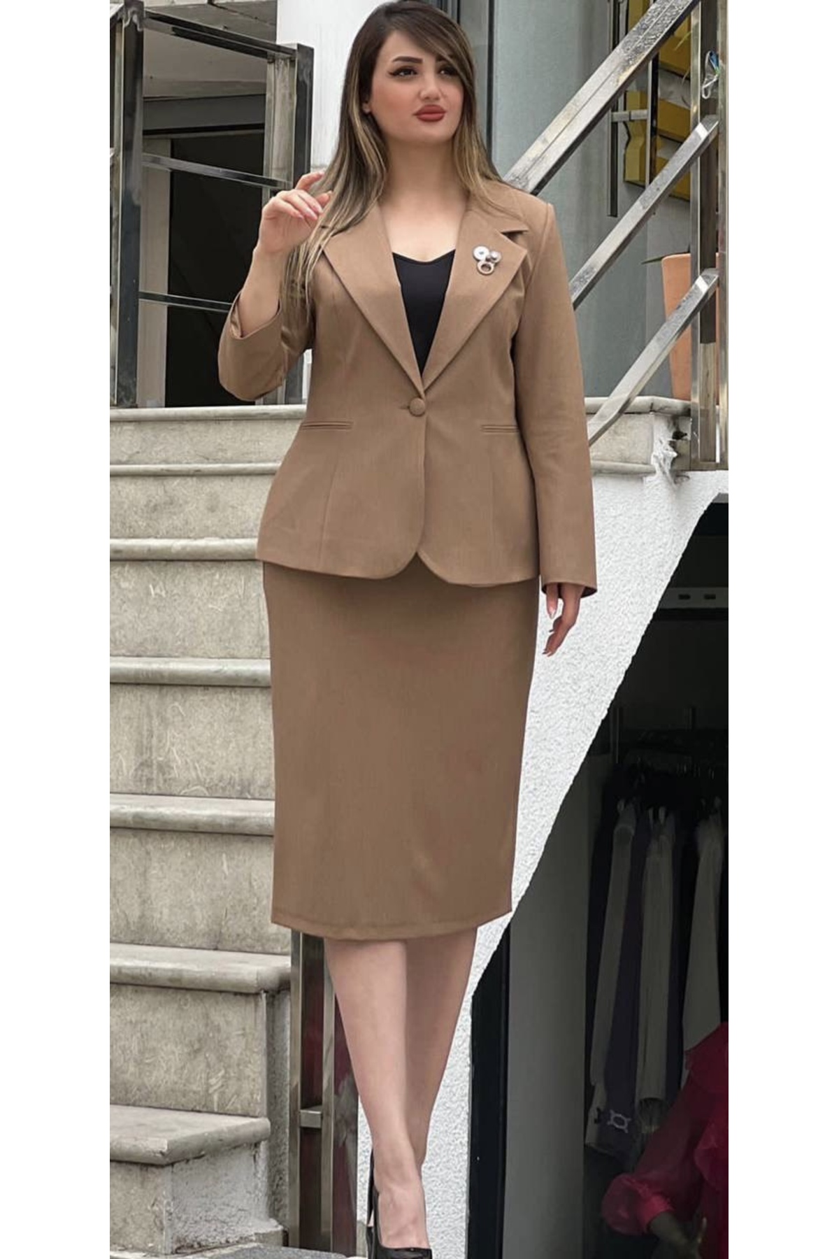 ميزات طقم سترة وتنورة بأزرار واحدة من MODAMOR