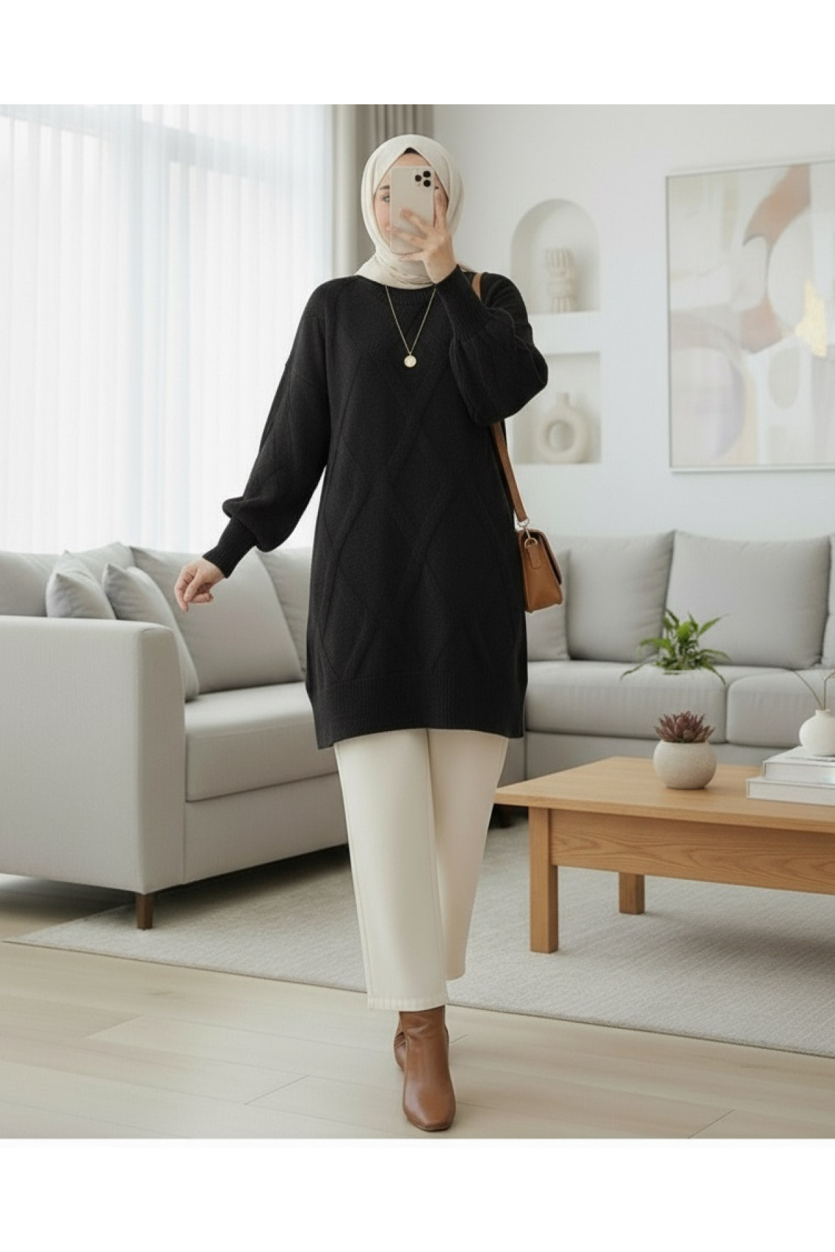 ميزات تونيك تريكو ناعم بنقشة البقلاوة - أسود من Modamorfo