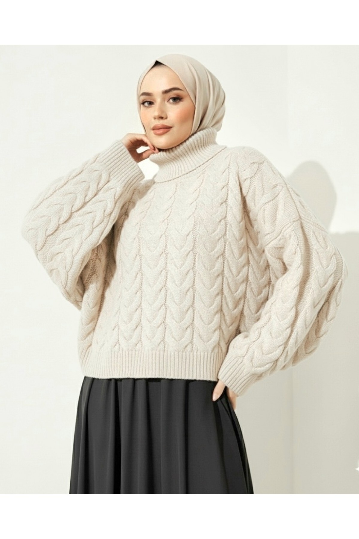ميزات سترة تريكو منسوجة ذات ياقة عالية - لون إكرو من Modamorfo