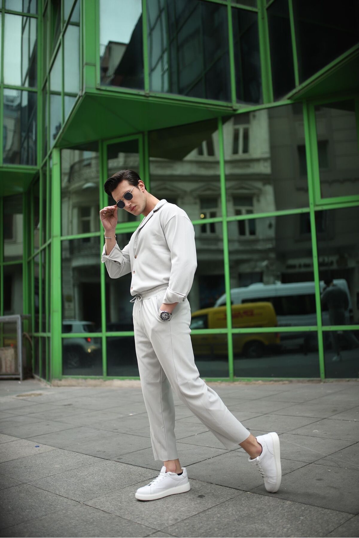 ميزات طقم قميص علوي وسفلي رجالي باللون الرمادي بنمط غير متماثل ونمط مموج من MODEFENDİ