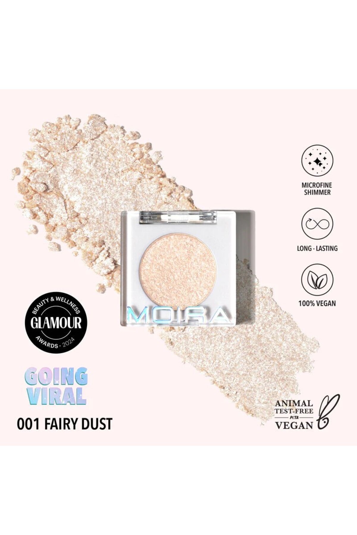 أولاً، ضعي برايمر ظلال العيون Moira (متوفر بشكل منفصل) على جفنيك. ثم ضعي اللون بفرشاة مسطحة أو صلبة وامزجيه بفرشاة أكثر نعومة للحصول على بريق أكثر شمولاً، أو استخدمي أطراف أصابعك لخلق التأثير المطلوب.