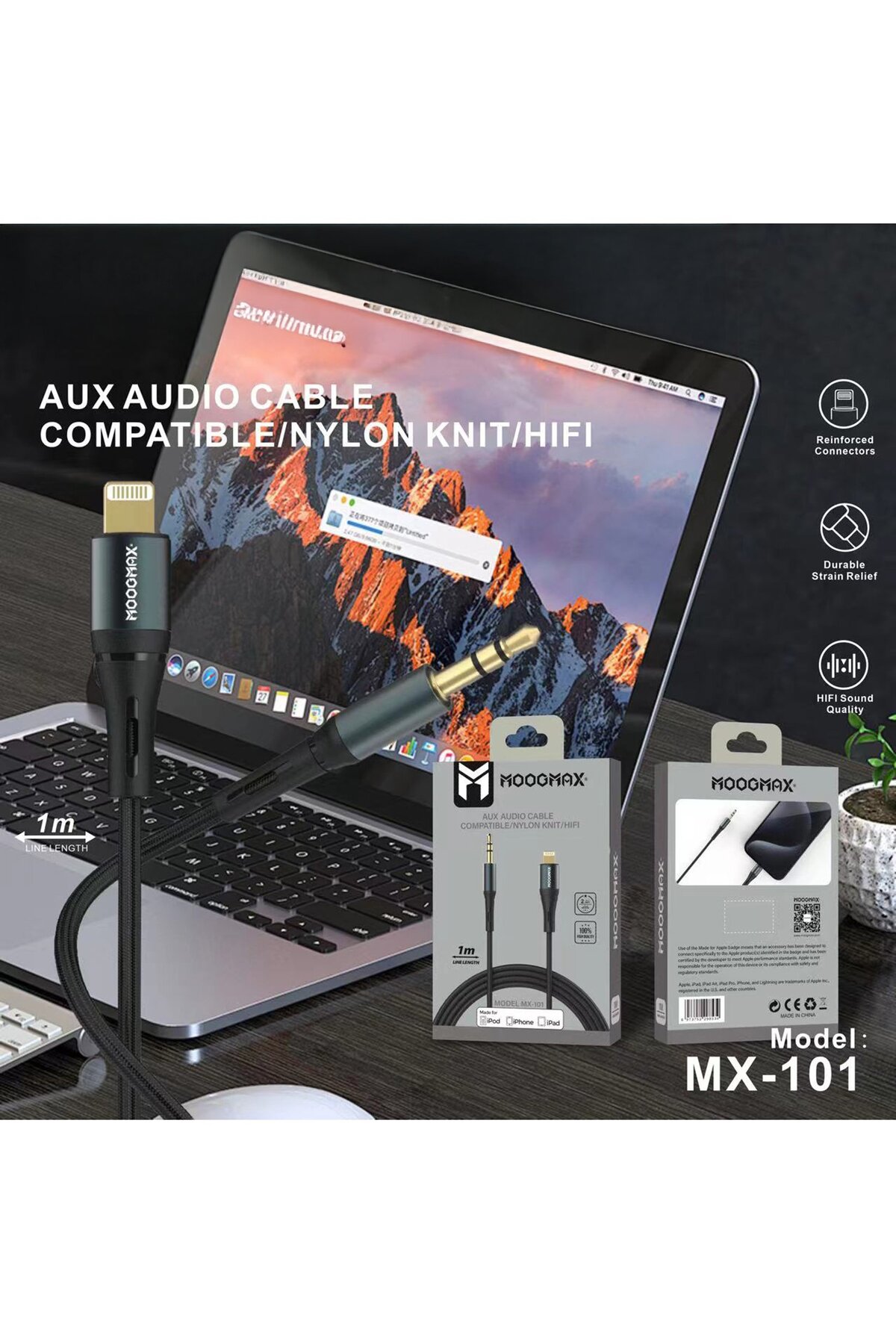ميزات كابل صوت AUX MX-101 بطول متر واحد، أسود من MOOGMAX