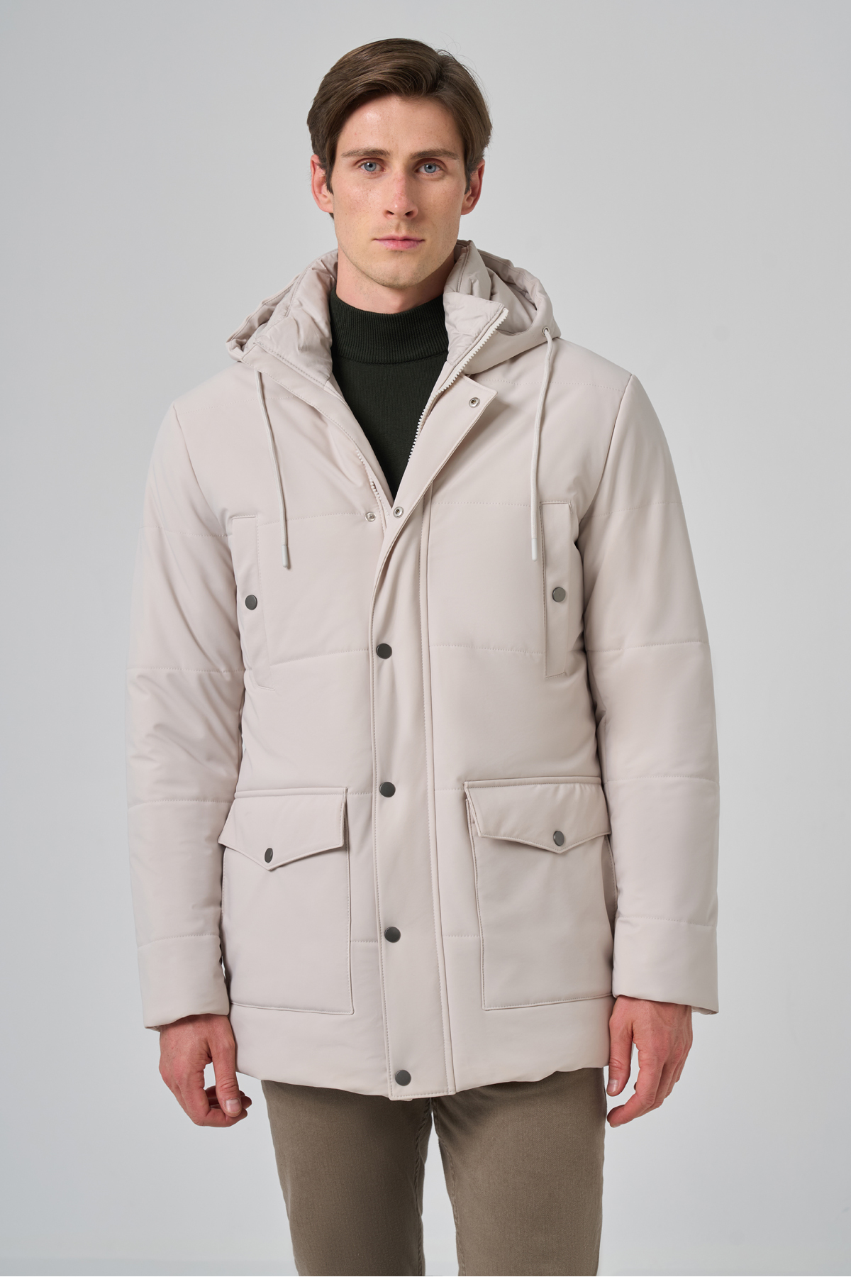 ميزات معطف رجالي رمادي اللون من البولي أميد مع غطاء للرأس وأزرار كبس من Morven