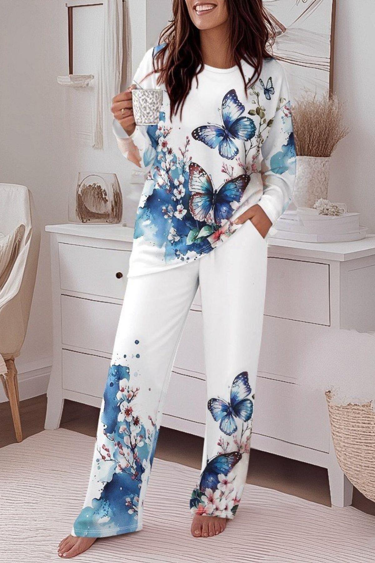 Mossta طقم مكون من قطعتين من قماش سوبرم بنمط الفراشة - أبيض