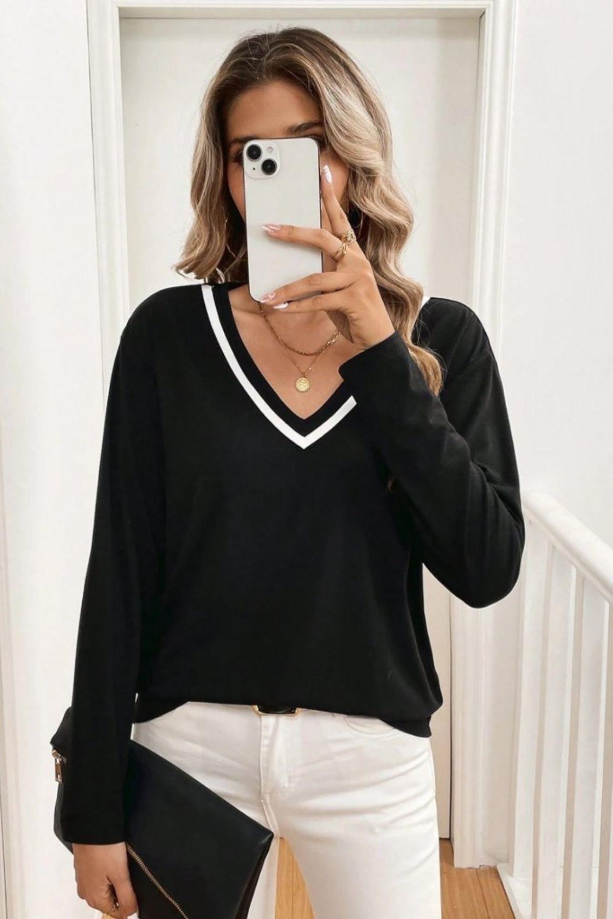 Mossta تفاصيل أسطوانية بلوزة أساسية بأكمام طويلة ورقبة على شكل حرف V