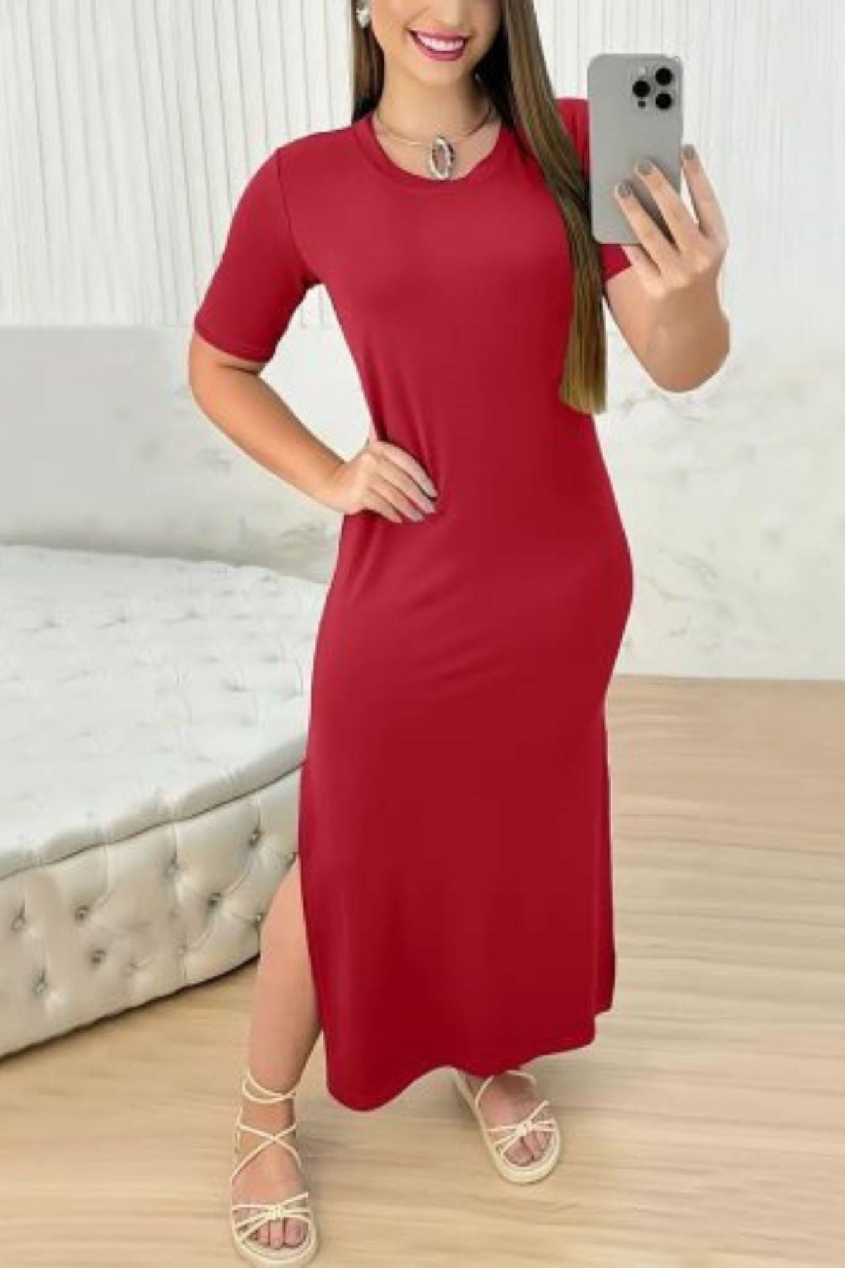 ميزات فستان أساسي بأكمام قصيرة وفتحة رقبة دائرية - أحمر من Mossta