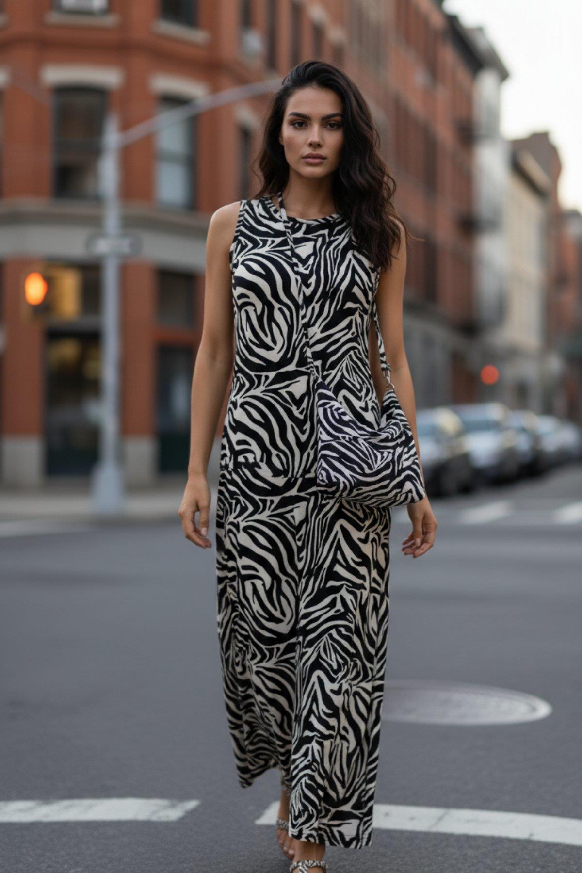 Mossta فستان طويل بدون أكمام برقبة دائرية وتصميم منقوش - منقوش